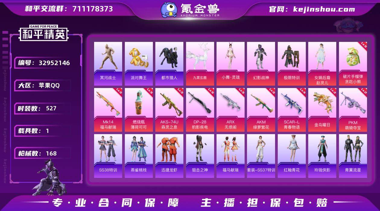 【和平精英账号出售】iOS QQ区|SS25战神框+白木乃伊+鹿马+多升级枪 iOS QQ SS25战神框 白木乃伊 赵灵儿 鹿马载具 多升级枪 简介:iOS QQ区,不可二次实名,SS25战神框+白色木乃伊+赵灵儿+九霄玄鹿载具,SCAR/AK升级枪+手雷/燃烧瓶/信号枪升级皮,极限特训、小金鞋、都市猎人、幻影战神齐全,诚心出,可小刀,平台包赔交易。 详细详情版(平台完整文案) 账号信息 • 区服:iOS QQ • 实名:不可二次实名 • 段位:SS25战神框 核心皮肤清单 • 稀有套装:冥河战士(白木乃伊)、女娲后裔(赵灵儿)、小舞、李逍遥 • 热门套装:都市猎人、幻影战神、极限特训主套、派对舞王(小金鞋)、阳光菠萝 • 载具皮肤:九霄玄鹿(鹿马) • 升级枪械:SCAR-L青春物语、AKM绿萝繁花(4级) • 升级投掷物:破片手榴弹贪吃小熊(5级)、燃烧瓶薄荷可可(5级)、信号枪金乌曜日(3级) • 战备:踏卷乘风飞行器、天马神君3级背包等等 • 挂牌价:3200元 • 诚心可小刀,急出可谈 • 只走DD373/氪金兽/交易猫正规平台,开启包赔,拒绝
