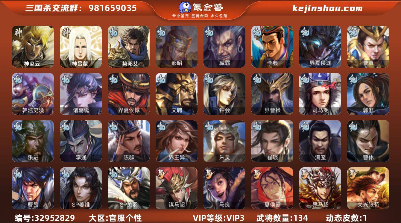 【14789904】官阶:先锋将军;VIP等级:VIP3;史诗武将数量:5;动态皮肤数量:1;武将总数:134;史诗宝珠数量:0;将魂数量:2739;神将:1;魏国史诗武将:0;蜀国史诗武将:1;吴国史诗武将:1;群史诗武将:0