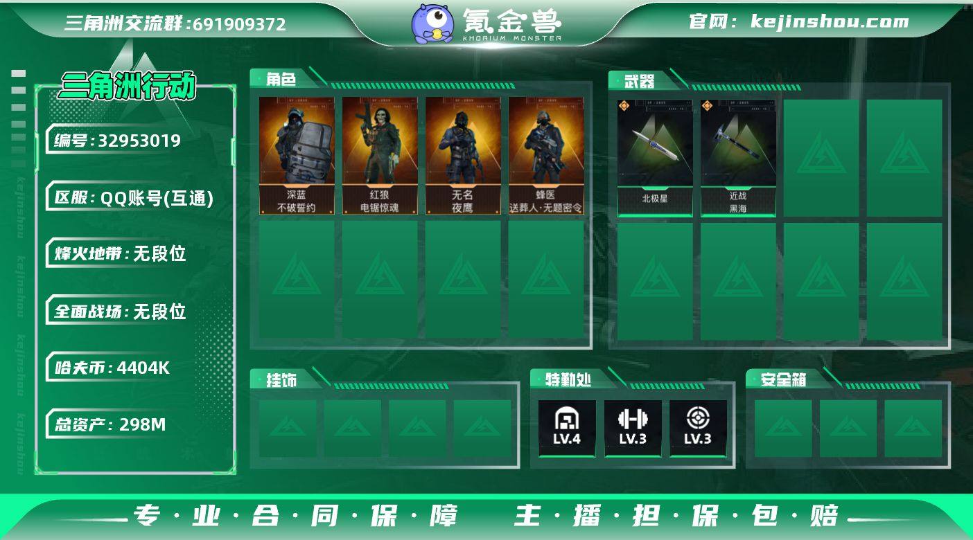 LJ5138总资产297.8M哈弗币4404K近战武器-北极星,近战武器-黑海红狼电锯惊魂,无名夜鹰,蜂医送葬人无题密令,深蓝不破誓约无无AW子弹0发三角币280仓库LV.7基础安全箱靶场LV.6训练中心LV.7无,红狼-电锯惊魂,无名-夜鹰,蜂医-送葬人·无题密令,深蓝-不破誓约,近战-北极星,近战-黑海