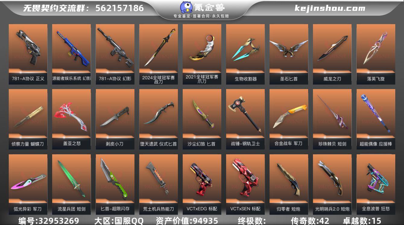 皮肤总价值94935,未定级,总皮肤170,刀皮20枪皮150(终极3传奇22卓越15),套装5(传奇4卓越1),2024全球冠军赛套装,2021全球冠军赛套装,盖亚的复仇套装 另外有三角形行动总资产400M,哈夫币7900w,近战3 枪皮数量437,骇爪-维什戴尔/露娜-黑天际线/红狼-蚀金玫瑰/无名-夜鹰/蜂医-送葬人无题密令/威龙-壮志凌云/深蓝-不破誓约/牧羊人-街头之王/露娜-金牌射手/红狼-电锯惊魂,近战-怜悯/近战-北极星/近战-黑鹰,战场等级50上等兵,行动等级60 特勤处仓库9其他满级 展厅价值1e哈夫币
