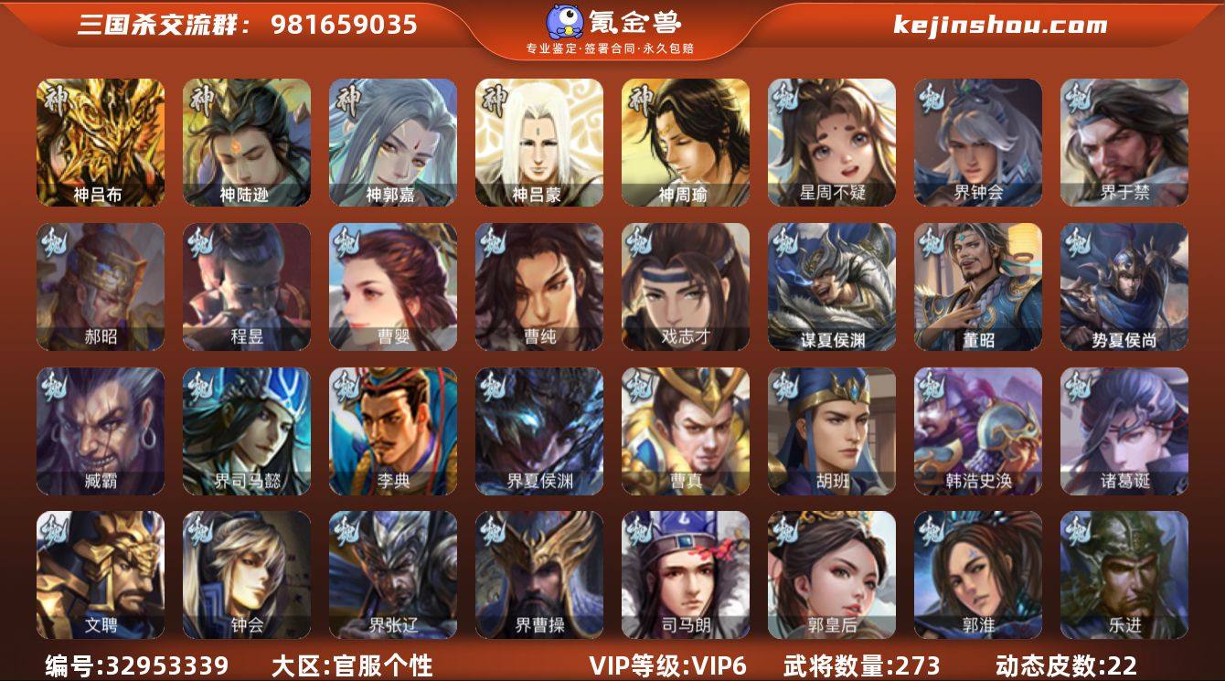 【3097】官阶:骠骑将军;VIP等级:VIP6;史诗武将数量:28;动态皮肤数量:22;武将总数:273;史诗宝珠数量:0;将魂数量:7811;神将:3;魏国史诗武将:10;蜀国史诗武将:6;吴国史诗武将:3;群史诗武将:3