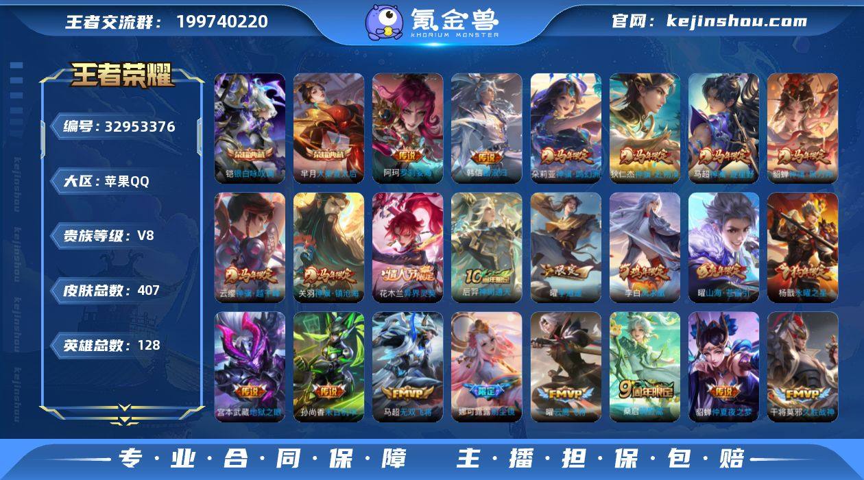 实名: 可修改 性别: 男号 贵族等级: V8 英雄数: 128 皮肤数: 407 荣耀水晶: 大秦宣太后,银白咏叹调 传说皮: 冠军飞将,云鹰飞将,久胜战神,末日机甲-孙尚香,地狱火,仲夏夜之梦,地狱之眼,李逍遥,无双飞将,音你闪耀,山海·苍雷引,妄想实况,金乌负日,神树通天,神骥·赴朔漠,神骥·鸣幻洲,神骥·越千峰,神骥·逐星野,神骥·镇沧海,神骥·聚万邦,异界灵契-花木兰,踏浪归,罗刹妄海 限定皮: 冰锋战神,遇见飞天,李小龙,游园惊梦,梁祝,云端筑梦师,引擎之心,辉光之辰,神威,永曜之星,时之彼端,飞衡,青春决赛季,逐梦之影,凤求凰,至尊宝,默契交锋-花木兰,霸王别姬-项羽,霸王别姬-虞姬,高山流水,玉兔公主,前尘镜,五谷丰年,鸣野蒿,逐霄战戟 亮点: 【优质装备】:大秦宣太后,银白咏叹调(倪克斯侍卫),冠军飞将,云鹰飞将(小将军),久胜战神,末日机甲-孙尚香(绿蚂蚱),地狱火,仲夏夜之梦(大飞蛾),地狱之眼,李逍遥,无双飞将,音你闪耀(rap皮),山海·苍雷引(电光曜子),妄想实况,金乌负日