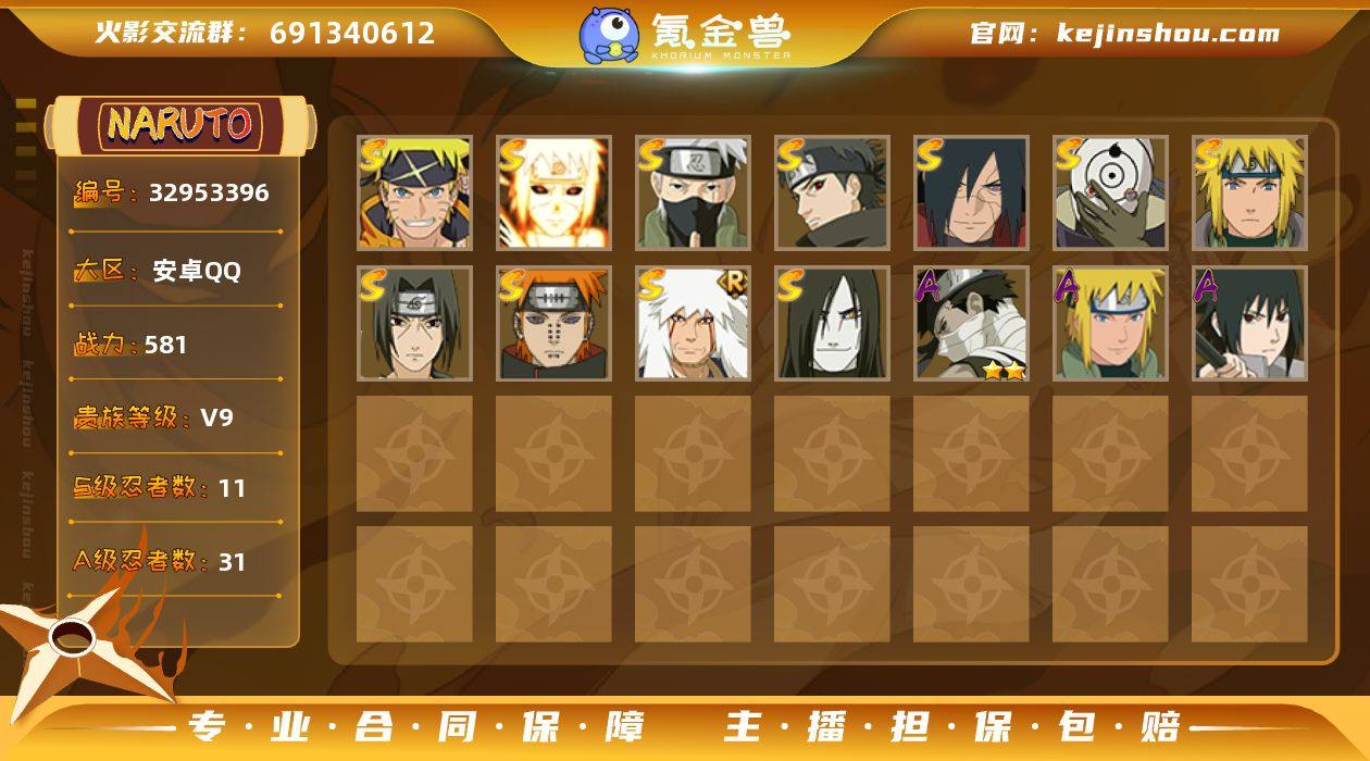 HY21833|【可实名】可二次 581w战力 v9 安卓QQ 2770区 S忍者数:11 A忍者数:31 时装15安卓QQ 2770区 S忍者数:11 A忍者数:31 忍者:漩涡鸣人·宇智波佐助,波风水门「九喇嘛连结」,旗木卡卡西「须佐能乎」,宇智波止水「须佐能乎」,宇智波斑「秽土转生·解」,自来也「舞之豪杰」,宇智波斑「白面具」,宇智波鼬「须佐能乎」,佩恩「天道」,波风水门,大蛇丸,小南「神驹佑将」,迈特凯「青春爆炸」,巳月「仙人模式」,宇智波佐助「侠隐江湖」,桃地再不斩「秽土转生」,宇智波泉奈,蝎「绯流琥」,不动,日向雏田「最终章」,宇智波鼬「夏日限定」,漩涡博人「桃式显现」,角都「秽土转生」,不缘,长十郎「六代目水影」,长门「青年」,达鲁伊「五代目雷影」,波风水门「青年」,黑土「四代目土影」,宇智波佐助「须佐能乎」,漩涡鸣人「九尾查克拉」,千代「近松十人卫」,秋道丁次「忍界大战」,宇智波佐助「万花筒写轮眼」,飞段「死司凭血」,飞段,我爱罗「疾风传」,蝎,干柿鬼鲛,宇智波鼬,猿飞阿斯玛,迈特凯,佩恩「畜生道」,重吾「忍界大战」,佩恩「地狱道」,野原琳「漂泊浪客」,佐井「最终章」,夕日红「冬日限定」,佩恩「饿鬼道」,奈良鹿丸「最终章」,佩恩「人间道」,天天「峨眉宗师」,枫「新佩恩六道」,萨...