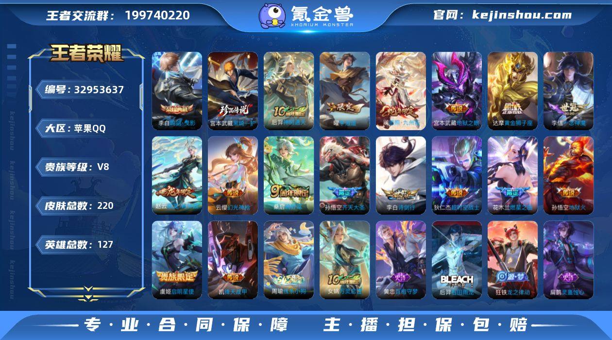 W15764 可立即换绑无需挂单养号 铭文满级 典藏1 传说16 按键7 夺宝103 苹果Q-V8-永恒钻石I段位-127英雄-220皮肤-1典藏皮肤-1珍品传说-16传说-57史诗 【荣耀典藏】:李白鸣剑曳影 【珍品传说】:宫本武藏黑崎一护 【传说皮肤】:后羿神树通天,澜愿照九州拓,云缨幻光神枪,桑启鸣野蒿,赵云乘龙铭钟鼎,花木兰燃星之曲,孙悟空齐天大圣,李白诗剑行,曜李逍遥 ,铠绛天战甲,虞姬启明星使,李信一念神魔,达摩黄金狮子座,宫本武藏地狱之眼,孙悟空地狱火,狄仁杰超时空战士 【限定皮肤】:大乔绒语心约,姜子牙天穹之誓,李白谪仙醉月,狄仁杰阴阳师,赵云皇家上将,嬴政优雅恋人,孙尚香蔷薇恋人,高渐离玩趣恶龙,吕布御风骁将,元歌云间偶戏,元歌无心,甄姬游园惊梦,狄仁杰魔术师,狄仁杰万华元夜,达摩星际陆战队,达摩沙漠行僧,项羽海滩派对,老夫子醍醐杖,程咬金演武夺筹,韩信傲雪梅枪,兰陵王金庭之子,花木兰燃星之曲,亚瑟潮玩骑士王,孙悟空美猴王,孙悟空至尊宝,孙悟空孙行者,孙悟空齐天大圣,李元芳云中旅人,虞姬启明星使,钟馗驱傩正仪,鬼谷子原初探秘者,鬼谷子五谷丰年,铠青龙志,苏烈千军破阵,沈梦溪大漠名商,明世隐疑决卦,裴擒虎李...