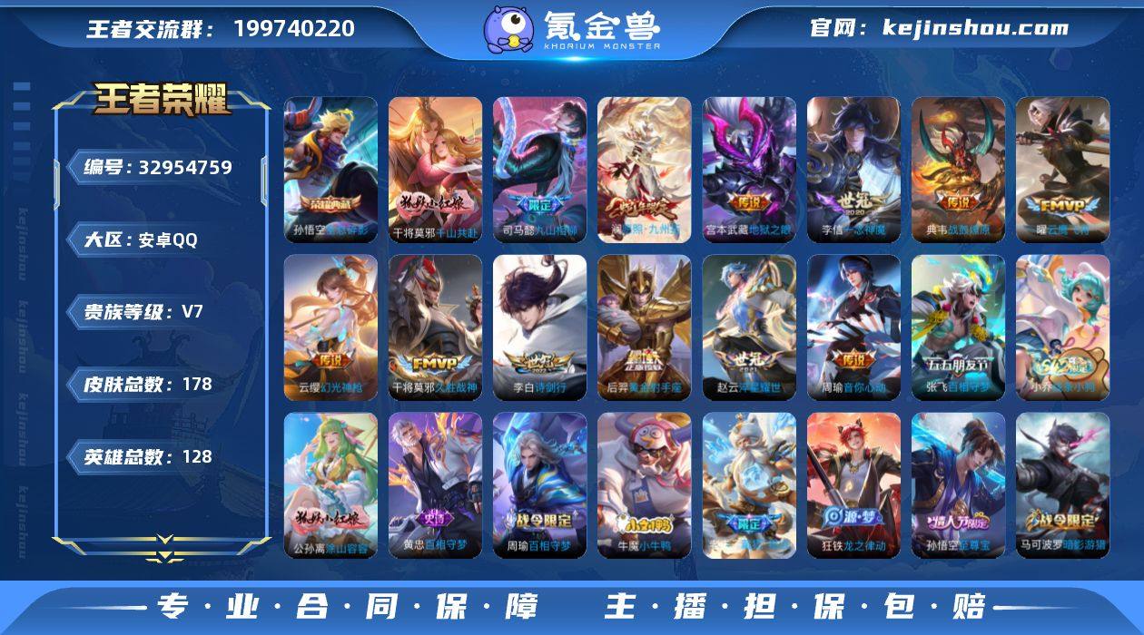 V7 1典藏 14传说 178皮肤 128英雄 【1水晶】孙悟空-全息碎影【14传说】李白-诗剑行,干将莫邪-久胜战神,宫本武藏-地狱之眼,后羿-黄金射手座,李信-一念神魔,赵云-淬星耀世,周瑜-音你心动,典韦-战鼓燎原,张飞-百相守梦,曜-云鹰飞将,云缨-幻光神枪,澜-愿照·九州拓,干将莫邪-千山共赴,司马懿-九山相柳【51史诗】元歌-无心,上官婉儿-神器·万象笔,高渐离-天秀·音浪,阿轲-节奏热浪,安琪拉-心灵骇客,白起-星夜王子,百里守约-特工魅影,百里玄策-热力回旋,曹操-幽灵船长,妲己-女仆咖啡,妲己-魅力维加斯,狄仁杰-魔术师,狄仁杰-鹰眼统帅,貂蝉-圣诞恋歌,伽罗-箭羽风息,宫本武藏-鬼剑武藏,花木兰-水晶猎龙者,黄忠-烈魂,橘右京-修罗,铠-曙光守护者,兰陵王-暗隐猎兽者,李元芳-逐浪之夏,廉颇-地狱岩魂,露娜-紫霞仙子,鲁班七号-电玩小子,吕布-圣诞狂欢,马可波罗-暗影游猎,墨子-金属风暴,沈梦溪-月团寄思,孙策-猫狗日记,孙尚香-水果甜心,孙尚香-时之恋人,孙悟空-至尊宝,王昭君-偶像歌手,夏侯惇-乘风破浪,小乔-缤纷独角兽,嬴政-摇滚巨星,嬴政-暗夜贵公子,张飞-乱世虎臣,赵云-皇家上将,赵云-龙胆,甄姬-冰雪圆舞曲,诸葛亮-黄金分割率,马可波罗-山海·玄木吟,狂铁-龙之律动,老夫子-藏狐·褐绒,牛魔-小牛...