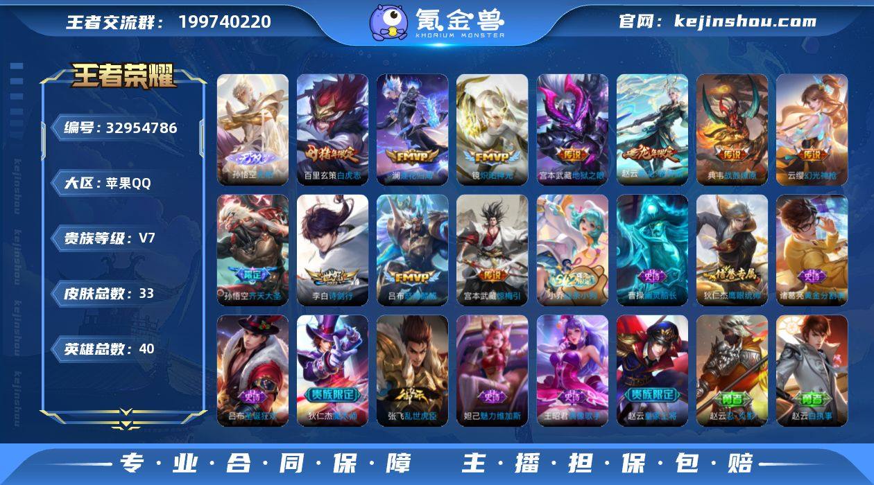 V7 1无双 13传说 33皮肤 40英雄 【1无双】孙悟空-无相【13传说】孙悟空-齐天大圣,李白-诗剑行,百里玄策-白虎志,宫本武藏-地狱之眼,镜-炽阳神光,吕布-怒海麟威,宫本武藏-惊梅引,典韦-战鼓燎原,赵云-乘龙·铭钟鼎,澜-逐花归海,云缨-幻光神枪【10史诗】曹操-幽灵船长,妲己-魅力维加斯,狄仁杰-魔术师,狄仁杰-鹰眼统帅,吕布-圣诞狂欢,王昭君-偶像歌手,张飞-乱世虎臣,赵云-皇家上将,诸葛亮-黄金分割率,小乔-线条小狗