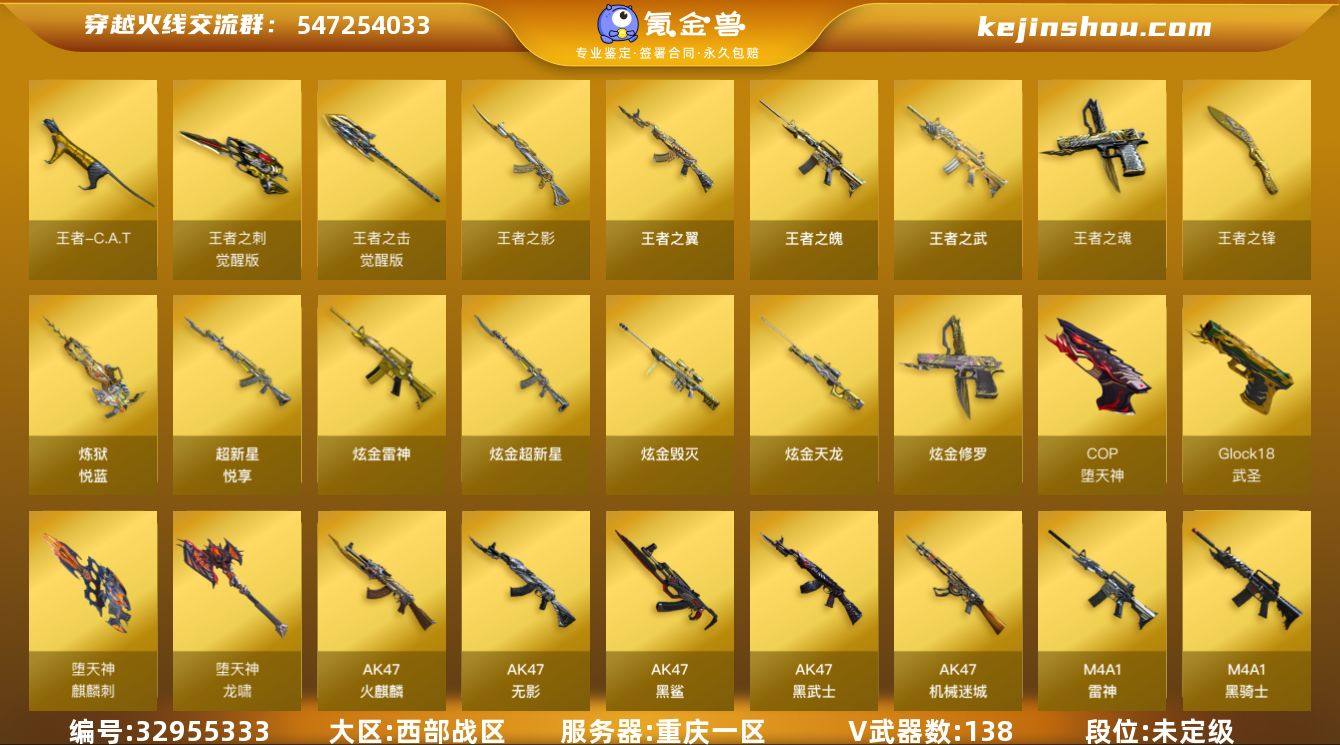 实名: 可修改 排位资格: 有 V武器: AK47-火麒麟,AK47-无影,AK47-黑鲨,AK47-黑武士,AK47-机械迷城,M4A1-雷神,M4A1-黑骑士,M4A1-黑龙,M4A1-堕天神,M4A1-雷霆,M4A1-武圣,M4A1-千变,Barrett-毁灭,Barrett-朱雀,AWM-天龙,AWM-裁决,M200-幻神,AA-12-雷霆,AN94-超新星,AK12-天启,QBZ03-金色蔷薇,9A91-烈火,RPK-盘龙,汤姆逊-烈龙,加特林-炼狱,沙鹰-修罗,COP雷霆,沙鹰-天神,屠龙,龙啸,擎天,Barrett-暗月传说,AK47-B-战士,AK47-B-战神,AK-47-猩红传说,裁决,烈龙,盘龙,龙啸-堕天神,麒麟刺-堕天神,Glock18-武圣,COP-堕天神 王者武器: 王者之魄,王者之武,王者之翼,超新星-悦享,王者之魂,炼狱-悦蓝,王者之影,王者之锋,王者之击-觉醒版,王者之刺-觉醒版 炫金武器: 炫金毁灭,炫金雷神,炫金天龙,炫金超新星,炫金修罗 热门武器: 王者-C.A.T,斯泰尔-蝴蝶,巴雷特-零-水下丽影,火麒麟-灵狐,M4A1-雷神-精英刀锋 狙击枪稀有皮肤: 毁灭-荣耀之怒,毁灭耀金皮肤,毁灭-星空,毁灭-黑大圣皮肤,AWM-天龙-传奇70KG,AWM-天龙-传奇白鲨,毁灭-荣耀之怒-网吧特权 英雄角色: 王者-葵-貂蝉,王者樱-热浪之夏,王者-迷迭香,王者救世主,王者葵-惊若翩鸿,王者-瞳-闭月羞花,王者-零-传说之路,炫,樱 音效道具: AK47-火麒麟...