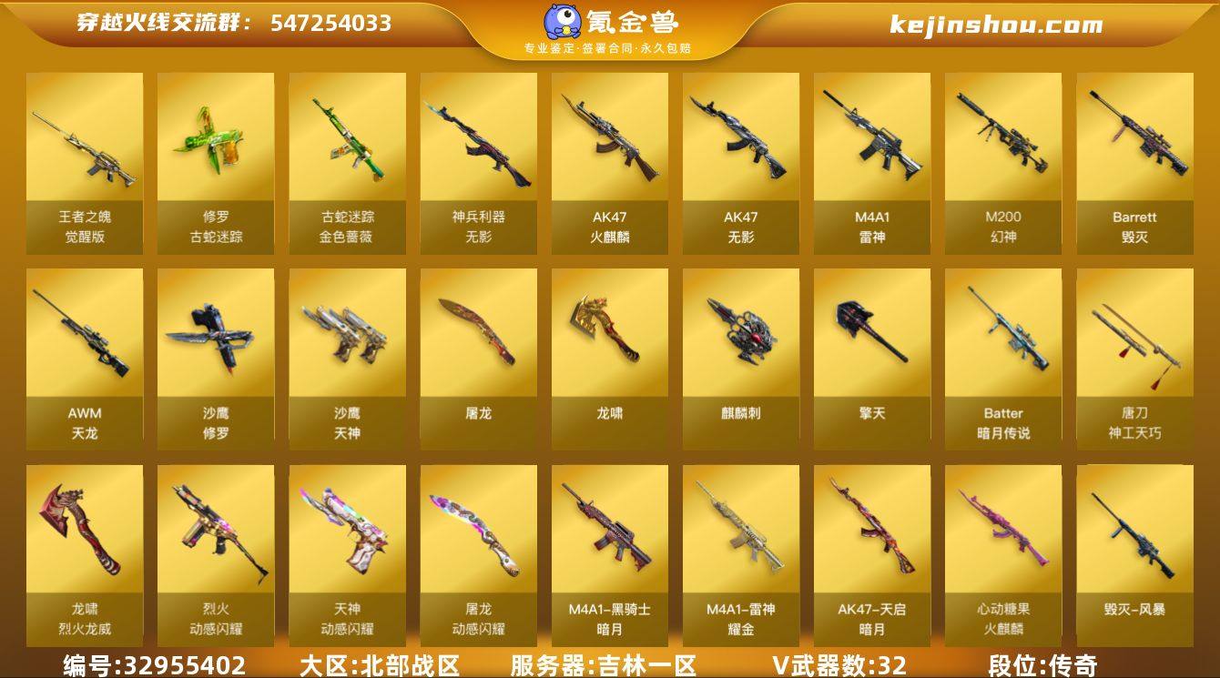 吉林一区-34V-1王者武器数-0炫金武器数 【热门武器】:M200-幻神,金色蔷薇-古蛇迷踪,修罗-古蛇迷踪,死亡之眼,沙鹰-修罗 【皮肤】:雷神-耀金皮肤,雷神-源计划2.0专属 皮肤,火麒麟-心动糖果,毁灭-暗月*2,毁灭-风暴,毁灭-英雄计划 皮肤,黑骑士-暗月,天启-暗月,天龙-能量核心,修罗-能量核心,屠龙-春桃 皮肤 【角色】:零,蛇隐宗,乔伊教练,暗夜-X,暗夜审判,初恋灵狐,电竞少女,风暴女,嘉年华灵狐,娟娟,曼陀罗-X,潘多拉-X,青霞仙子,蛇姬,斯沃特-X,铁骑荣耀,兔囡囡,团团 【人偶武器】:AWM-灵狐-15周年嘉年华,迷你深渊冰龙,迷你牛魔王,迷你波特博士,生化手雷-机甲核心*4,深渊终结者手雷*2,迷你巨石泰坦-魔花研究所,灵狐娃娃手雷 【暴走生化】:死亡之眼 【挑战大师】:冰龙粉碎者-白马银枪,激光毁灭者III-白马银枪,神圣爆裂者-末日III 【英雄级武器】:AK47-火麒麟*2,M4A1-雷神,AK47-无影,无影-神兵利器,金色蔷薇-古蛇迷踪,烈火-动感闪耀,王者之魄-觉醒版,AWM-天龙,Barrett-毁灭,M200-幻神,Barrett-金色蔷薇,Barrett-暗月传说,沙鹰-修罗,沙鹰-天神*2,天神-动感闪耀,修罗-古蛇迷踪,屠龙,龙啸,擎天,麒麟刺,唐刀-神工天巧...
