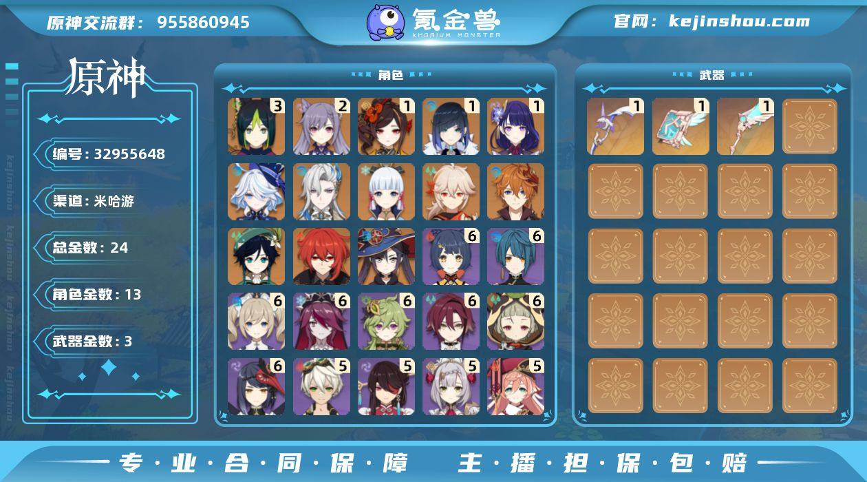 24黄! 冒险等级: 59 3命金色角色: 三命提纳里 2命金色角色: 二命刻晴 1命金色角色: 一命雷电将军,一命夜兰,一命千织 0命金色角色: 迪卢克,温迪,枫原万叶,神里绫华,达达利亚,莫娜,那维莱特,芙宁娜 拥有武器: 天空之翼,天空之卷,阿莫斯之弓 1精武器: 天空之翼,天空之卷,阿莫斯之弓