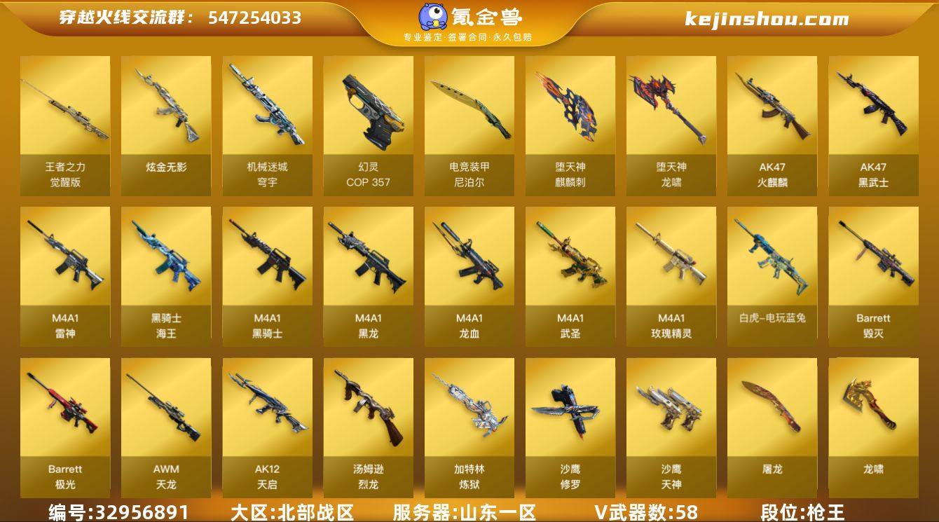 【ky6627】山东一区-64V-1王者武器数-1炫金武器数 【热门武器】:死亡之眼,白虎-电玩蓝兔,M4A1-黑骑士,汤姆逊-烈龙*6,加特林-炼狱,羊驼玩偶,雷神-小红,COP 357-幻灵,沙鹰-修罗*4 【王者炫金武器】:炫金无影 【音效卡】:M4A1-雷神音效卡,M4A1-黑骑士音效卡 【皮肤】:雷神-暗月,火麒麟-雷神,毁灭-星空,毁灭-英雄计划 皮肤,M4A1-千变-孔明皮肤*2,黑骑士耀金皮肤,天启-暗月*3,战神-紫绶金章皮肤,战神-流金岁月皮肤,AK47-B-常胜将军-曹操,AK47-B-常胜将军-刘备*2,AK47-B-常胜将军-孙权,AWM-天龙-传奇白鲨,极光-能量核心,修罗-能量核心*2,天神-暗月*2 【角色】:零,魅影,零·纪元,奇洋探员,乔伊教练,修道士,云海玲珑,暗夜-X,芳心审判者,风暴女,灵狐者-X,潘多拉-X,潘多拉-甜心教官,潜龙队-X,蛇姬,蜀雪,铁骑荣耀,兔囡囡,影武者-X,团团 【人偶武器】:雷神-小红,迷你裂空之翼*3,迷你波特博士*3,迷你曼提柯尔,夺魂,迷你牛牛,迷你火种*4,生化手雷-机甲核心,深渊终结者手雷,闪光弹-小乔,迷你超能女侍,灵狐娃娃手雷 【暴走生化】:死亡之眼,超级对讲机 【挑战大师】:AK47-冰龙粉碎者,冰龙粉碎者-白马银枪,激光毁灭者III,机甲...