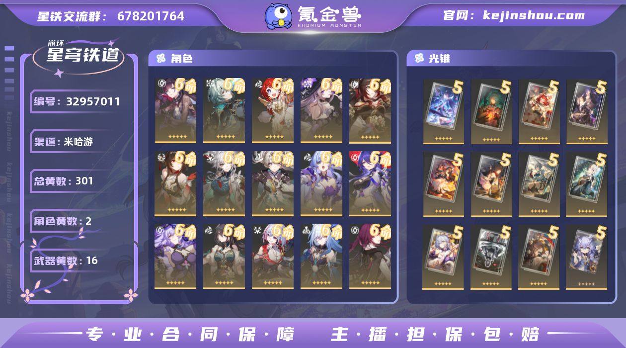 总黄数: 301 五星光锥数: 16 五星角色数: 2 开拓等级: 70 开拓者性别: 女 6命金色角色: 6命彦卿,6命白露,6命布洛妮娅,6命杰帕德,6命卡芙卡,6命镜流,6命托帕&账账,6命阮•梅,6命黑天鹅,6命黄泉,6命知更鸟,6命流萤,6命飞霄,6命灵砂,6命忘归人,6命大黑塔,6命缇宝,6命那刻夏,6命海瑟音 5命金色角色: 5命姬子,5命瓦尔特 4命金色角色: 4命刃 3命金色角色: 3命花火 2命金色角色: 2命符玄,2命藿藿,2命砂金,2命翡翠 1命金色角色: 1命克拉拉 精5武器: 精5时节不居,精5记一位星神的陨落,精5星海巡航,精5镜中故我,精5行于流逝的岸,精5夜色流光溢彩,精5梦应归于何处,精5不息的演算,精5我将,巡征追猎,精5唯有香如故,精5长路终有归途,精5向着不可追问处,精5记忆永不落幕,精5如果时间是一朵花,精5生命当付之一炬,精5海洋为何而歌 精4武器: 精4但战斗还未结束,精4银河铁道之夜,精4重塑时光之忆 精3武器: 精3如泥酣眠,精3制胜的瞬间,精3以世界之名,精3无可取代的东西 精1武器: 精1拂晓之前,精1到不了的彼岸,精1只需等待,精1她已闭上双眼,精1此身为剑,精1烦恼着,幸福着,精1惊魂夜,精1记忆的质料,精1孤独的疗愈,精1游戏尘寰,精1命运从未公平,精1偏偏希望无价,精1纵然山河万程 亮点: 【xt195】等级...
