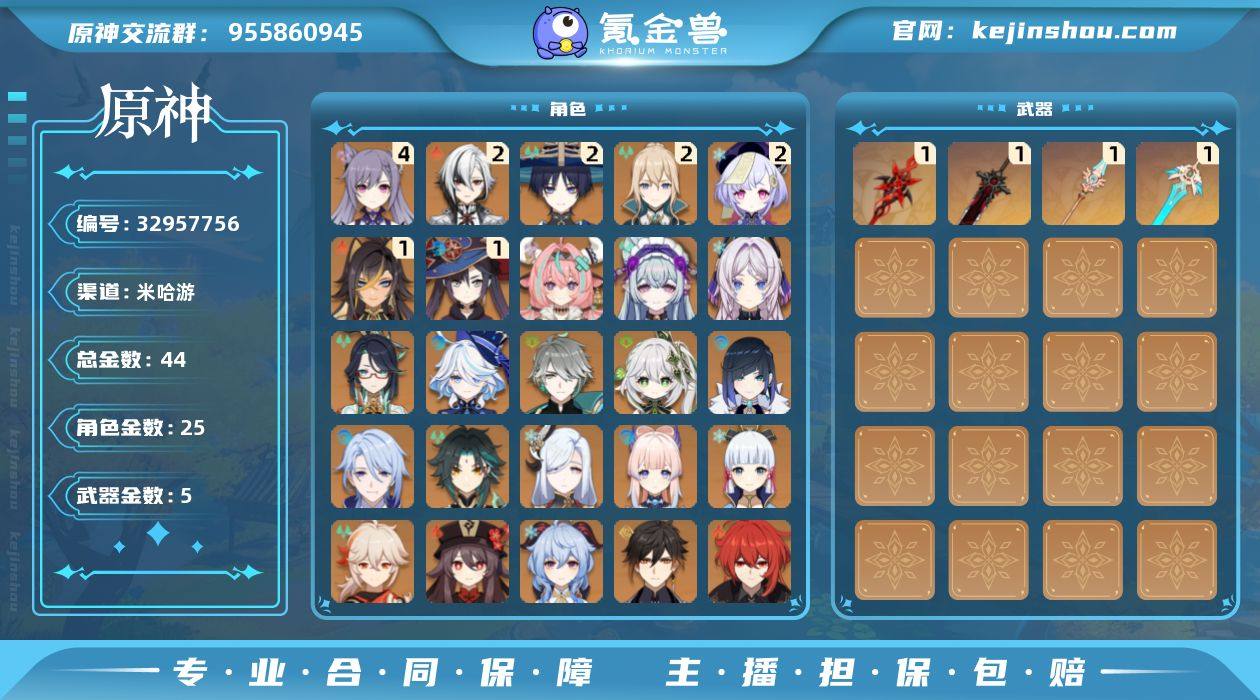 邮箱: 未绑定 总黄数: 44 冒险等级: 60 4命金色角色: 四命刻晴 2命金色角色: 二命七七,二命琴,二命流浪者,二命阿蕾奇诺 1命金色角色: 一命莫娜,一命迪希雅 0命金色角色: 迪卢克,枫原万叶,神里绫华,钟离,甘雨,魈,胡桃,珊瑚宫心海,申鹤,神里绫人,夜兰,纳西妲,艾尔海森,芙宁娜,闲云,茜特菈莉,梦见月瑞希,瓦雷莎 拥有武器: 狼的末路,天空之刃,天空之脊,赤月之形 1精武器: 狼的末路,天空之刃,天空之脊,赤月之形 亮点: 【sy121】60级/44黄/男主/25个五星角色/5个五星武器2命阿蕾奇诺,0命闲云,0命芙宁娜,1命迪希雅,0命艾尔海森,2命流浪者,0命纳西妲,0命夜兰,0命神里绫人,0命申鹤,0命枫原万叶,0命神里绫华,0命钟离,0命胡桃,0命甘雨,0命魈,0命珊瑚宫心海,4命刻晴,2命七七,2命琴,1命莫娜,0命迪卢克,0命茜特菈莉,0命梦见月瑞希,0命瓦雷莎,精1赤月之形,精1天空之脊,精1天空之刃,精1狼的末路