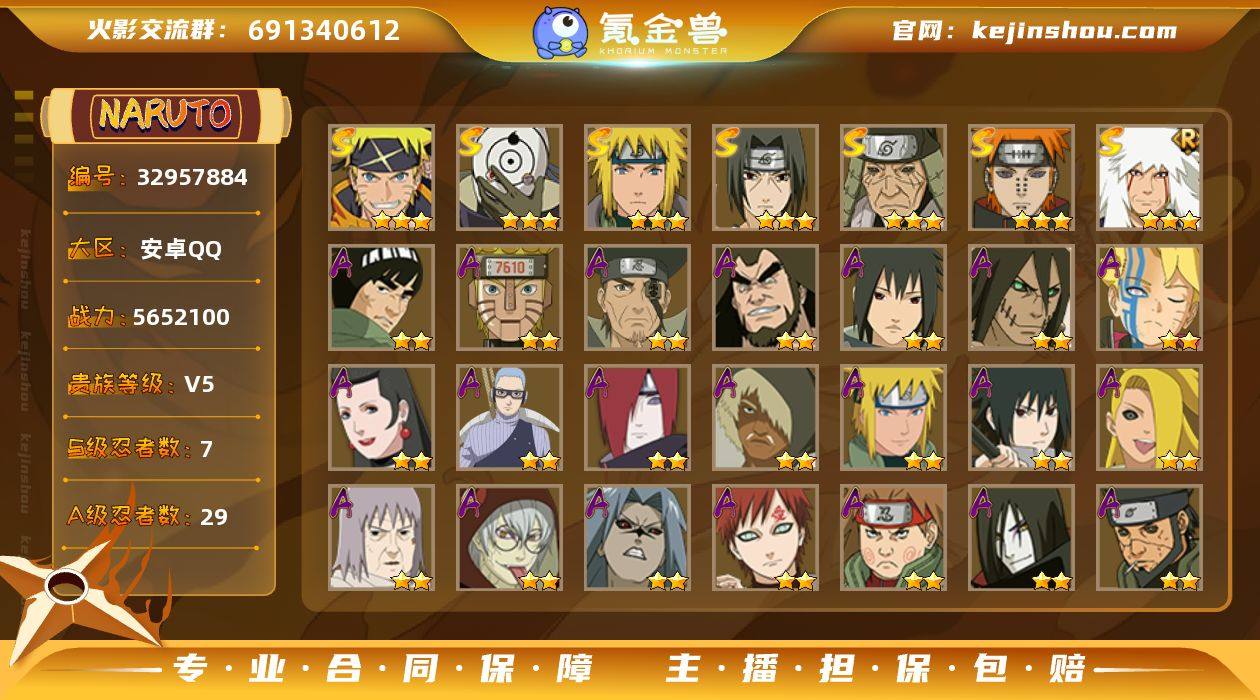 7S忍/29A忍/战力565W/V5/区服3433 【S忍者】 宇智波佐助「漩涡鸣人」,自来也「舞之豪杰」,宇智波斑「白面具」,猿飞日斩「秽土转生」,宇智波鼬「须佐能乎」,佩恩「天道」,波风水门, 【A忍者】 机械鸣人「初始形态」,迈特凯「青春爆炸」,土台「忍界大战」,长十郎「六代目水影」,不缘,漩涡博人「桃式显现」,宇智波泉奈,神农「羁绊」,角都「秽土转生」,长门「青年」,达鲁伊「五代目雷影」,波风水门「青年」,宇智波佐助「须佐能乎」,迪达拉「秽土转生」,千代「近松十人卫」,药师兜「半蛇斗篷」,宇智波佐助「疾风传咒印」,我爱罗「忍界大战」,秋道丁次「忍界大战」,大蛇丸「晓」,猿飞阿斯玛「秽土转生」,宇智波佐助「万花筒写轮眼」,飞段「死司凭血」,我爱罗「疾风传」,蝎,干柿鬼鲛,猿飞阿斯玛,迈特凯,桃地再不斩, PX_2480070