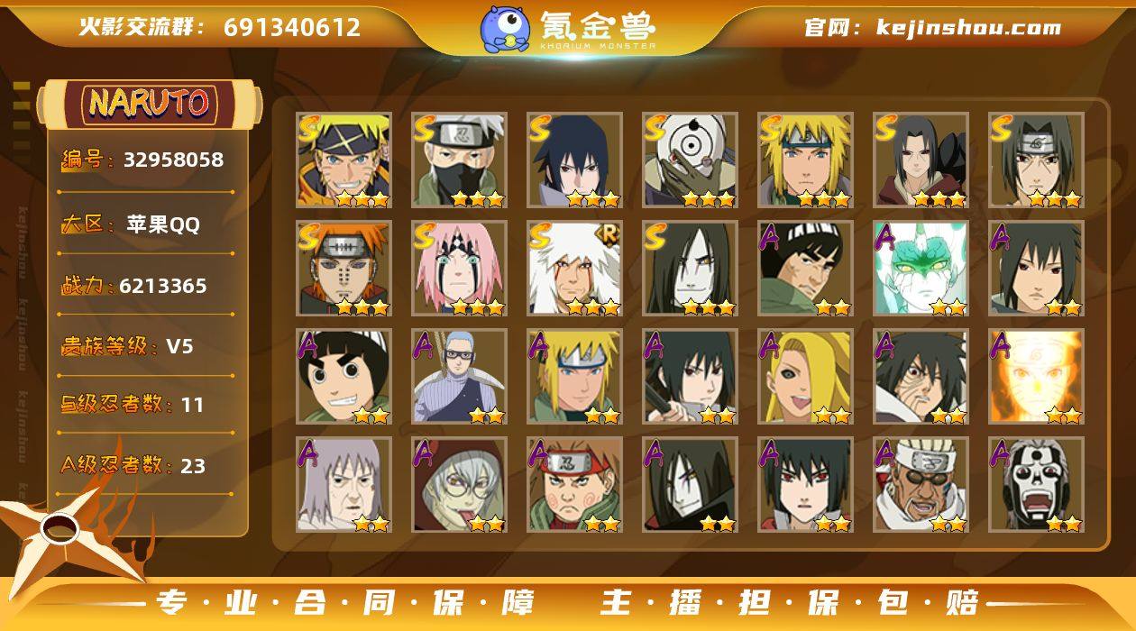 IOS/11S忍/23A忍/战力621W/V5/区服2078 【S忍者】 宇智波佐助「漩涡鸣人」,宇智波佐助「永恒万花筒」,春野樱「忍界大战」,自来也「舞之豪杰」,旗木卡卡西「须佐能乎」,宇智波鼬「秽土转生」,宇智波斑「白面具」,宇智波鼬「须佐能乎」,佩恩「天道」,波风水门,大蛇丸, 【A忍者】 巳月「仙人模式」,迈特凯「青春爆炸」,长十郎「六代目水影」,李洛克「忍界大战」,宇智波泉奈,波风水门「青年」,宇智波佐助「须佐能乎」,迪达拉「秽土转生」,宇智波带土「暴怒」,漩涡鸣人「九尾查克拉」,千代「近松十人卫」,药师兜「半蛇斗篷」,秋道丁次「忍界大战」,大蛇丸「晓」,宇智波佐助「万花筒写轮眼」,奇拉比,飞段「死司凭血」,飞段,我爱罗「疾风传」,蝎,干柿鬼鲛,猿飞阿斯玛,迈特凯, PX_2479665