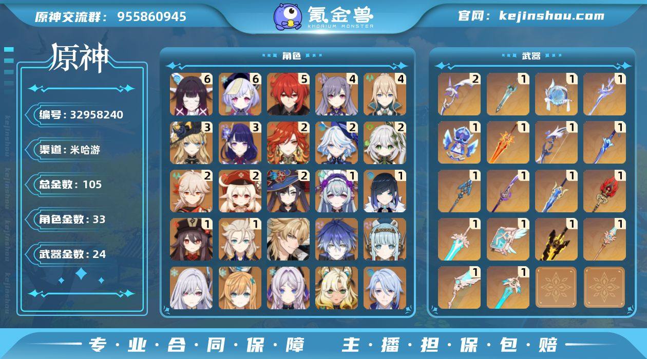 邮箱: 未绑定 总黄数: 105 冒险等级: 60 6命金色角色: 满命七七,满命哥伦比娅 5命金色角色: 五命迪卢克 4命金色角色: 四命刻晴,四命琴 3命金色角色: 三命雷电将军,三命娜维娅 2命金色角色: 二命枫原万叶,二命可莉,二命莫娜,二命纳西妲,二命芙宁娜,二命玛薇卡 1命金色角色: 一命阿贝多,一命胡桃,一命夜兰,一命梦见月瑞希 0命金色角色: 温迪,钟离,甘雨,珊瑚宫心海,荒泷一斗,八重神子,神里绫人,提纳里,迪希雅,希诺宁,茜特菈莉,爱可菲,丝柯克,伊涅芙,菲林斯,法尔伽 拥有武器: 天空之翼,天空之卷,阿莫斯之弓,天空之傲,天空之刃,无工之剑,天空之脊,护摩之杖,松籁响起之时,薙草之稻光,息灾,波乱月白经津,若水,焚曜千阳,祭星者之望,苍耀,帷间夜曲,狼的武功歌 2精武器: 阿莫斯之弓 1精武器: 天空之翼,天空之卷,天空之傲,天空之刃,无工之剑,天空之脊,护摩之杖,松籁响起之时,薙草之稻光,息灾,波乱月白经津,若水,焚曜千阳,祭星者之望,苍耀,帷间夜曲,狼的武功歌 亮点: 【sy126】105黄33人满命少女3命雷神2命火神 丝柯克带专武2命水神等1970360级/105黄/女主/33个五星角色/24个五星武器3命娜维娅,2命芙宁娜,0命迪希雅,2命纳西妲,0命提纳里,1命夜兰,0命神里绫人,0命八重神子,0命荒泷一斗,3命...