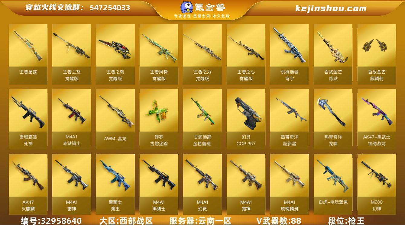【ky6629】云南一区-101V-6王者武器数-0炫金武器数 【热门武器】:QBZ03-金色蔷薇,Scar Light-白虎,M200-幻神,金色蔷薇-古蛇迷踪,修罗-古蛇迷踪,死亡之眼*2,白虎-电玩蓝兔,M4A1-黑骑士,汤姆逊-烈龙*2,雷神-小红,COP 357-幻灵*2,沙鹰-修罗*2,炽芒蝶刃*2,炽芒蝶刃-破浪逐光 皮肤 【王者炫金武器】:王者星霆 【音效卡】:炼狱-百战金芒-庆典舞曲音效卡,死神-雪域霜狐-怀旧音效卡 【皮肤】:M200-幻神-荣耀世冠白鲨,幻神-电竞之星 皮肤,白虎-霓虹机甲 皮肤,金色蔷薇-电竞之星 皮肤,裁决-巅峰荣耀 皮肤,裁决-叶芒苍灵 皮肤,裁决-星际旅行 皮肤,雷神-暗月,雷神-能量核心,雷神-耀金皮肤,雷神-杨戬,雷神-源计划2.0专属 皮肤,M4A1-再燃火线,雷神-神秘按键 皮肤,毁灭-暗月,毁灭-黑曼巴 皮肤,毁灭-虹光风暴 皮肤,毁灭-秦师 皮肤,毁灭-英雄计划 皮肤,黑骑士-暗月*3,黑骑士-CFS2021,无影-暗月*4,无影耀金皮肤,死神-秘银,天龙-能量核心,修罗-能量核心,天神-暗月*4,轻型军用手斧-再燃火线,麒麟刺-甜蜜糖果 皮肤,炽芒蝶刃-破浪逐光 皮肤 【角色】:葵,炫,影豹,雨墨,机械姬,零·纪元,战地猎狐,王者樱-热浪之夏,雪域霜狐,蛇隐宗,奇洋探员...