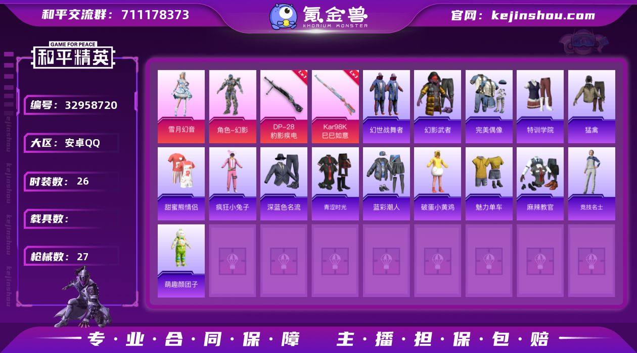 可二次【1粉装3特效枪可秒换绑】 安卓Q区-8652热力值--26套装-27枪皮 【1粉装】 雪月幻音【2特效枪】 Kar98K-巳巳如意(3级) DP-28-豹影疾电(4级)【6热门】 长空猛禽 甜蜜熊情侣 破蛋小黄鸡 Mk47-乌木金纹 UMP45-蓝色火焰 MG3-幻世战舞者 营地ID:1034419936