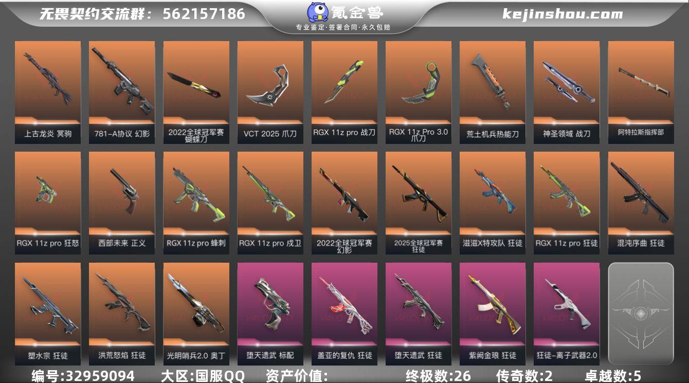 【946905】【6.7w库存22冠军套.VCT爪刀.黑波之刃.显卡爪刀.生物分子解离器.镭切.显卡直刀.落英飞旋.十狂徒双幻影混沌.塑水宗.流脓.显卡.水枪.25冠军.781协议】YXy6465【无二次】【因赛季更新游戏段付以上号为准!】 【套装】:2022全球冠军赛套装,RGX 11z Pro套装,VCT 2025 赛季套装 【英雄】:幻棱,炼狱,维斯,暮蝶,钛狐,壹决,铁臂,捷风,雷兹,幽影,不死鸟,贤者,猎枭,蝰蛇,零,芮娜,奇乐,尚勃勒,霓虹,斯凯,夜露,星礈,K/O,海神,盖可,黑梦,钢锁 【近战武器】:近战武器-2022全球冠军赛 蝴蝶刀,近战武器-RGX 11z Pro 战刀,近战武器-神之刃,近战武器-VCT 2025 爪刀,近战武器-RGX 11z Pro//3.0 爪刀,近战武器-黑波之刃,近战武器-落英飞旋,近战武器-镭切,近战武器-双生獠牙,近战武器-荒土机兵 热能刀,近战武器-生物分子解离器,近战武器-影刃,近战武器-神圣领域 战刀,近战武器-阿特拉斯指挥部 甩棍 【狂徒】:狂徒-2025全球冠军赛,狂徒-洪荒怒焰,狂徒-混沌序曲,狂徒-塑水宗,狂徒-RGX 11z Pro,狂徒-滋滋X特攻队,狂徒-堕天遗武,狂徒-盖亚的复仇,狂徒-紫阙金琅,狂徒-离子武器//2.0,狂徒-荒土机兵,狂徒-诡秘蛇影 【幻影】:幻影-2022全...