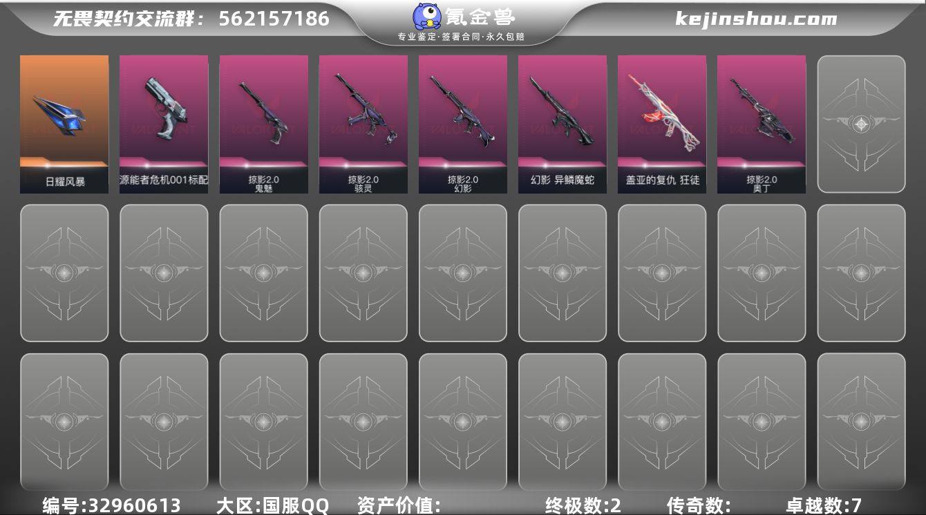 段位: 未定级 套装: 掠影2.0套装 近战武器皮肤: 日耀风暴 步枪皮肤: 狂徒-盖亚的复仇,幻影-异鳞魔蛇,幻影-掠影2.0 佩枪皮肤: 标配-源能者危机001,鬼魅-掠影2.0 冲锋枪皮肤: 骇灵-掠影2.0 机枪皮肤: 奥丁-掠影2.0 亮点: 【套装】:掠影//2.0套装【英雄】:幻棱,炼狱,维斯,暮蝶,捷风,幽影,不死鸟,贤者,猎枭,蝰蛇,零,芮娜,霓虹,海神,盖可,黑梦,钢锁【近战武器】:近战武器-影钩,近战武器-日耀风暴 遗器【狂徒】:狂徒-盖亚的复仇【幻影】:幻影-异鳞魔蛇,幻影-掠影//2.0【奥丁】:奥丁-掠影//2.0【骇灵】:骇灵-掠影//2.0【标配】:标配-源能者危机001【鬼魅】:鬼魅-掠影//2.0【卡面】:无畏契约:暮蝶 卡面,无畏契约GO!第一卷:芮娜 卡面,无畏契约GO!第一卷:零 卡面,《双城之战》金克丝 卡面,代号红色 卡面,新兵报到 卡面,V契约 卡面,无畏契约 卡面【喷漆】:伤心心 喷漆,买装还是存钱 喷漆,胜利属于无畏契约 喷漆,GLHF 喷漆,无畏契约 喷漆【挂饰】:天外飞客 挂饰,无畏契约 纪念币 挂饰
