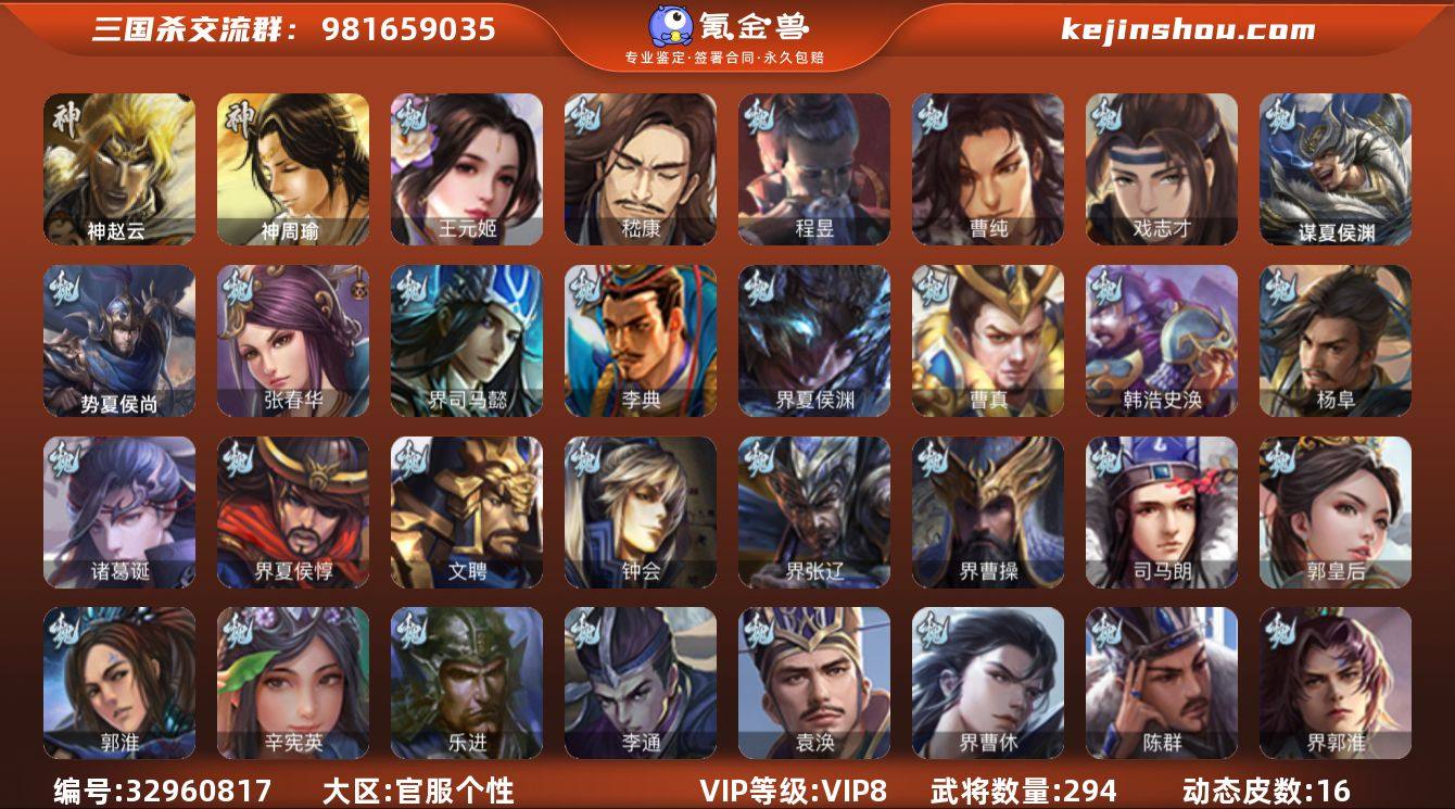 【3807】官阶:骠骑将军;VIP等级:VIP8;史诗武将数量:26;动态皮肤数量:16;武将总数:294;史诗宝珠数量:25;将魂数量:3293;神将:1;魏国史诗武将:8;蜀国史诗武将:6;吴国史诗武将:4;群史诗武将:10