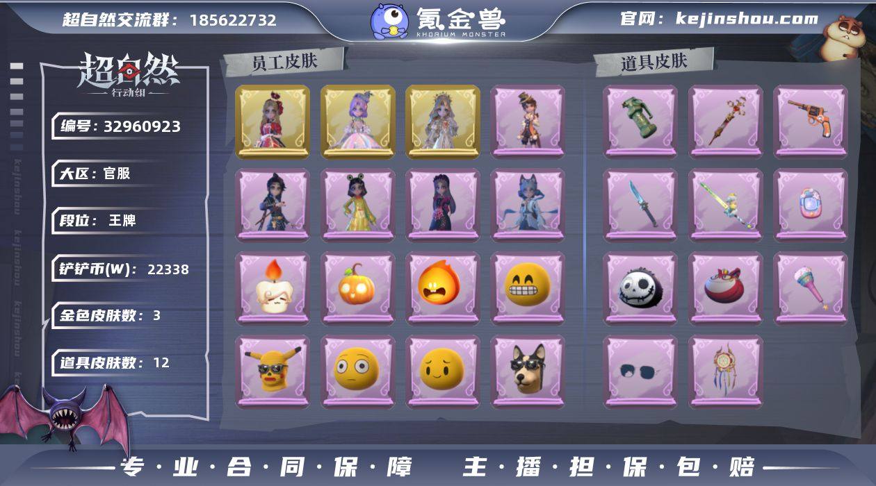 金皮3;紫皮5;道具皮12;皮肤:小黄-遗失的童话,爱丽丝-血色中的玛丽,薇薇安-圣光之谕,小黄-呱呱雨衣,阿念-庆宴绮愿,小黄-青丘一梦,逍遥-绣春逍影,爱丽丝-丝缕哀歌;道具:音响-鸣沙鼓,专业手电-云端梦想计划,桃木剑-小羊波德莱尔剑,急救包-蔷薇物语,闪光弹-金戈玄铜,腰包-惊魂娃娃,急救包-末章心跳,传送按钮-幻宠之门,刺刀-青瓷,夜视仪-金丝眼镜,转轮手枪-新星时代,腰包-绯红柴郡猫;饰品:头饰-咬咬鲨头套,头饰-火爆了头套,头饰-烛光纪念,头饰-鳄霸天头套,头饰-龙傲天头套,头饰-面具马头套,头饰-腊肠扭扭,头饰-呆滞头套,头饰-驼半仙头套,头饰-惊魂南瓜头套,头饰-嘻嘻头套,头饰-小狗蛇点点头套,头饰-哈士奇头套,头饰-鱼头怪头套,头饰-滑稽头套,头饰-卑微头套,头饰-萨卡班甲鱼头套,头饰-烈焰红唇头套,头饰-伤心蛙头套,头饰-笨笨河豚头套,头饰-哞哞牛头套,头饰-像素朋克墨镜,头饰-后室幸存者头套,挂饰-晚安小熊,挂饰-钗头凤,挂饰-小鲨包包,挂饰-小小玛丽,背饰-牛啤背包,背饰-梵音莲华,背饰-小小罗丽;动作:动作-孤身摇,动作-青海摇,动作-舞台中心,动作-心跳摇,动作-伤心摇,动作-DL摇,动作-luvaboy,动作-鸳鸯戏,动作-抬手,动作-举牌,动作-要糖,动作-晚安公主舞,动作-KT猫摇;...