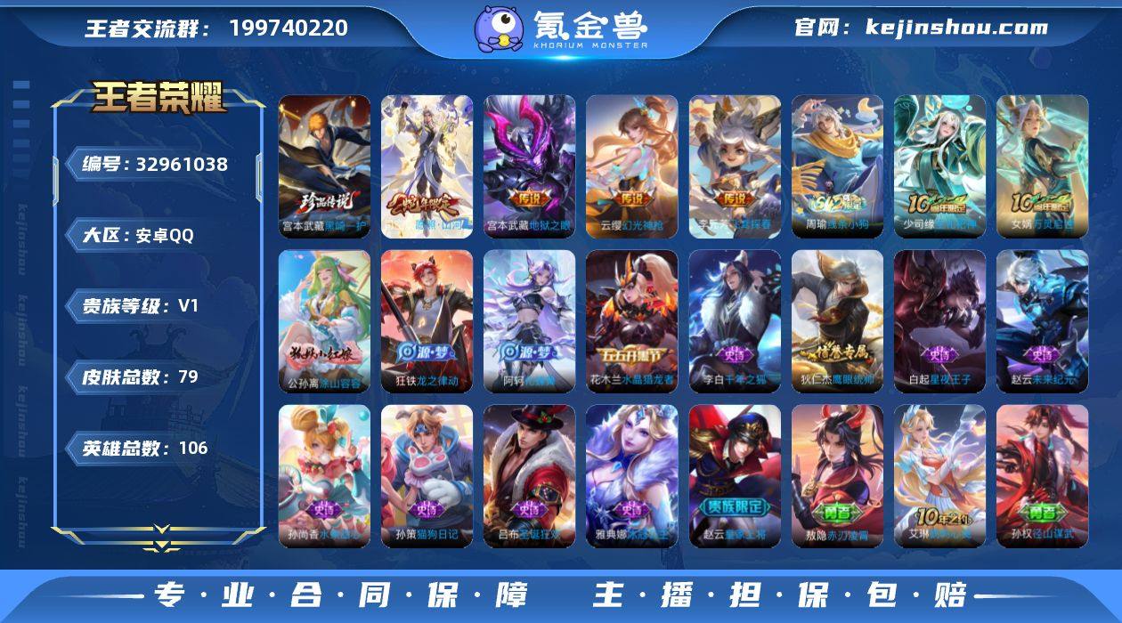 不可二次 安卓Q-V5-至尊星耀III段位-106英雄-79皮肤-1珍品传说-4传说-15史诗 QW264113 【英雄全皮】:孙权全皮,敖隐全皮 【珍品传说】:宫本武藏黑崎一护 【传说皮肤】:司空震愿照山河定,云缨幻光神枪,李元芳飞鸢探春,宫本武藏地狱之眼 【限定皮肤】:狄仁杰阴阳师,赵云皇家上将,项羽海滩派对,沈梦溪龙舞盛年 【年限皮肤】:司空震愿照山河定 【赛季限定】:东皇太一噬灭天穹,太乙真人谧流熔炉,钟馗虚灵犬护,亚瑟荣光之誓 【战令限定】:周瑜线条小狗 【史诗皮肤】:周瑜线条小狗,少司缘巫礼祀神,女娲万灵启世,公孙离涂山容容,狂铁龙之律动,阿轲化蝶舞,狄仁杰鹰眼统帅,孙策猫狗日记,白起星夜王子,雅典娜冰冠公主,花木兰水晶猎龙者,李白千年之狐,吕布圣诞狂欢,孙尚香水果甜心,赵云未来纪元,赵云皇家上将 【其他皮肤】:艾琳鹤鸣心笺,孙权径山谋武,亚瑟荣光之誓,哪吒罗小黑战记,庄周锦麟游梦,白起死霸装,姬小满小满鸭,露娜命运加冕,阿古朵布丁狗之约,张良灵野札记,小乔秘证寻踪,苏烈春野闲踪,钟馗虚灵犬护,刘备浪漫序章,戈娅玫蓝誓约,明世隐景韶洛都,达摩爆裂喵拳,西施雪境奇遇,典韦铁骨偃魂,太乙真人谧流熔炉,苍苍林狼骑,东皇...