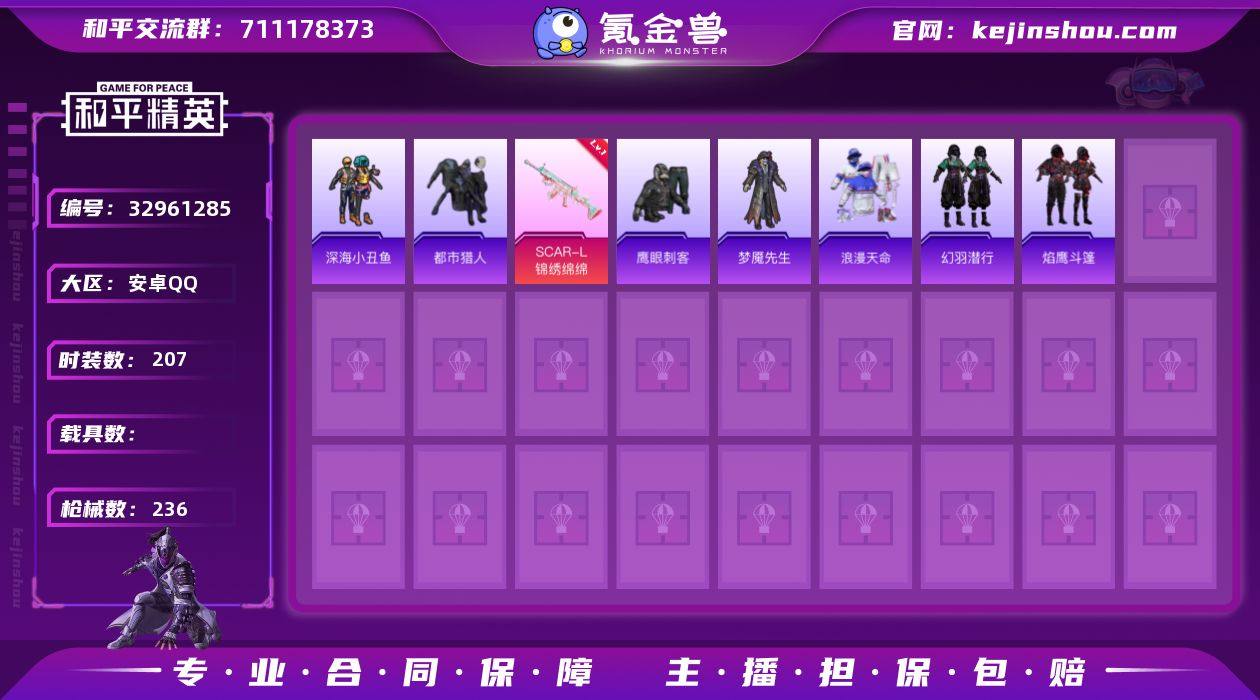【稀有枪皮】14-甜梦熊击,AUG-暖羊咩咩,GROZA-镜光银凌,Kar98K-巳巳如意,ACE32-萌骑漫游,UMP45-萌骑冒险,信号枪-金乌曜日,AKS-74U-森灵之息,14-福马献瑞,SCAR-L-锦绣绵绵