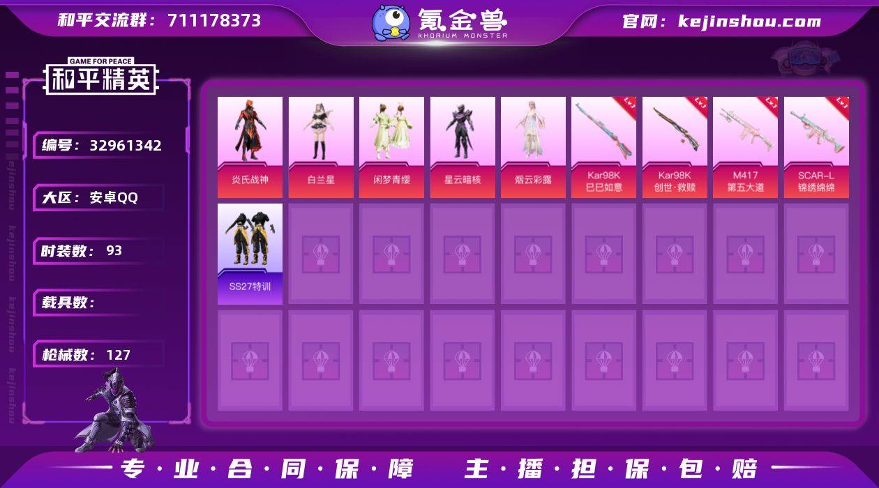【5粉装4特效枪可秒换绑】 安卓Q区-37876热力值-5印记-93套装-127枪皮 【5粉装】 星云暗核 白兰星 闲梦青缨 角色-烟云彩露 炎氏战神【4特效枪】 SCAR-L-锦绣绵绵(5级) M417-第五大道(5级) Kar98K-创世·救赎(4级) Kar98K-巳巳如意(1级)【29热门】 M416-蓝色火焰 GROZA-彩虹符号 QBZ-银碳小老虎 长空猛禽 霓虹街区 妙红点点 懵萌河马 浪漫天命 破蛋小黄鸡 极速红龙 纯白誓言 白色伏地魔 SS27特训 SS26特训 SS25特训 SS24特训 SS23特训 SS22特训 M24-歌者泠鸢 SCAR-L-玉兔迎春 M762-天降萌叽 Mk47-乌木金纹 SKS-糯团青竹 UMP45-蓝色火焰 UMP45-炫光之旅 DBS-彩虹符号 M249-彩虹符号【4飞行器】 粉色滑翔尾迹 黄族统领飞行器 空岛之星尾迹 花傲天飞行器 营地ID:939006526