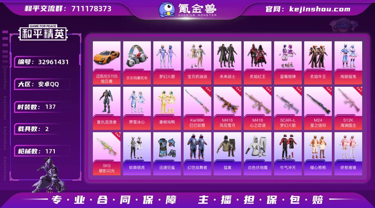 10粉装 7粉枪 2载具 1稀有装备 137套装 171枪皮 51热门 迈凯伦570S(旭日黄) 布尔玛摩托车 奇异狩猎者 梦幻火箭 宝贝奶油派 复仇流浪者 蓝莓炮弹 垂柳戏鸭 绚丽摇曳 炙焰红王 霁雪冰心 炙焰牛王 未来战士 M416-心之恋语(6级) M416-风花雪月(1级) SKS-碧影闪光(5级) SCAR-L-梦幻火箭(4级) M24-星之信仰(4级) S12K-海渊国主(7级) Kar98K-巳巳如意(1级) 雪山精英(老6服) 迅捷狂鲨 金羽特工 军刀雅典娜 英勇保护者 醒狮腾龙 团圆交子 瑞龙福将 GROZA-林间仙鹿 白色伏地魔 SS25特训 SS24特训 SS23特训 SS22特训 NV战队服 Mini14-千面幻镜 Mini14-梦幻火箭 M24-百合蜜语 Kar98K-王子的夏天 AKM-环太平洋 SCAR-L-玉兔迎春 GROZA-田园牧歌 AUG-幻影战神 M762-天降萌叽 M762-彩虹符号 Mk47-乌木金纹 SKS-糯团青竹 Mini14-旋转彩虹 UZI-娇憨猪猪 M416-夜灯 S12K-垂柳戏鸭 DBS-彩虹符号 M249-彩虹符号 MG3-幻世战舞者 AKM-虎虎生威 M416-紫翼圣骑 M416-葫芦兄弟 GROZA-异彩先驱 GROZA-蓝莓炮弹 软萌银虎 长空猛禽 异彩先驱 虚音幻奏 甜心亚梦 暖心熊熊 牛气冲天 霓虹街区 霓虹极客 妙红点点 懵萌河马 S686-奇异狩猎者 全功率超战飞行器 千面幻镜飞行器 梦幻火箭飞行器 星夜魔法师飞行翼