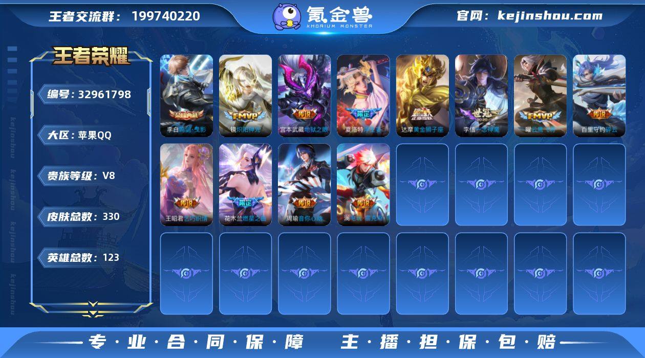 【商品标题】:苹果Q-V8-至尊星耀III段位-123英雄-330皮肤-1典藏-0珍品无双-0无双-2珍品传说-13传说-95史诗 【荣耀典藏】:李白鸣剑曳影 【珍品传说】:马可波罗怪盗基德,安琪拉酷洛米之心 【内测皮肤】:孙尚香蔷薇恋人,高渐离玩趣恶龙,狂铁特工战影 【传说皮肤】:宫本武藏地狱之眼,达摩黄金狮子座,李信一念神魔,曜云鹰飞将,虞姬启明星使,镜炽阳神光,周瑜音你心动,王昭君乞巧织情,百里守约碎云,花木兰燃星之曲,夏洛特浮生妄,澜电玩雷克斯,桑启鸣野蒿 【限定皮肤】:姜子牙天穹之誓,狄仁杰阴阳师,赵云皇家上将,墨子神迹守卫,孙尚香蔷薇恋人,庄周高山流水,高渐离死亡摇滚,高渐离玩趣恶龙,钟无艳超时空战士,扁鹊奇幻香踪,白起夜都怪侠,芈月幻夜卜梦,吕布御风骁将,元歌云间偶戏,元歌无心,甄姬游园惊梦,甄姬落雪兰心,曹操烛龙,典韦穷奇,马可波罗暗影游猎,马可波罗山海玄木吟,狄仁杰魔术师,狄仁杰万华元夜,达摩沙漠行僧,项羽海滩派对,老夫子醍醐杖,老夫子航海奇遇记,关羽百相守梦,程咬金演武夺筹,韩信傲雪梅枪,王昭君午后时光,兰陵王金庭之子,花木兰燃星之曲,亚瑟潮玩骑士王,孙悟空至尊宝,牛魔御旌,后羿圣弓游侠,李元芳云中...