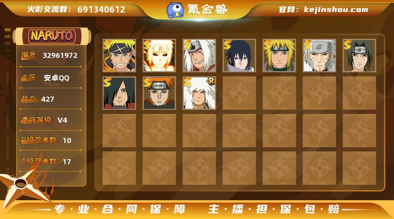 实名: 可修改 贵族等级: V4 S忍数: 10 A忍数: 17 战力值(万): 427 S级忍者: 千手扉间「秽土转生」,宇智波斑,佩恩「天道」,波风水门,宇智波鼬 「须佐能乎」,自来也 「舞之豪杰」,宇智波佐助「永恒万花筒」,自来也 「传说中的三忍」,波风水门「九喇嘛连结」,漩涡鸣人·宇智波佐助 亮点: 【优质装备】:千手扉间「秽土转生」,宇智波斑,宇智波佐助「永恒万花筒」,自来也 「传说中的三忍」霸体lv6
