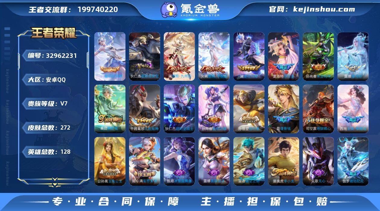 实名: 可修改 性别: 女号 贵族等级: V7 英雄数: 128 皮肤数: 272 荣耀水晶: 最初的交响 星传说: 星际治安官 传说皮: 久胜战神,末日机甲-孙尚香,超时空战士-狄仁杰,音你闪耀,浮生妄,霜月吟,澜逐花归海 限定皮: 李小龙,奔雷神使,孙行者,玉兔公主,至美·乘鲤谣,鸣野蒿,愿照·千秋盛,愿照·九州拓
