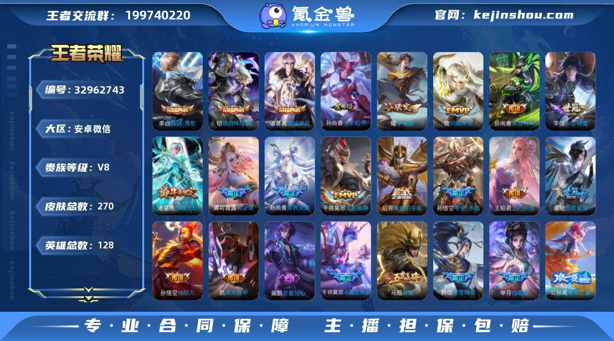 ·星域神启·银白咏叹调·无相·前尘镜·孙尚香异界灵契·李逍遥·时雨天司·零号赤焰·一念神魔·绛天战甲·炽阳神光·乞巧织情·无二次包过】w20453-安卓WX-128英雄-270皮肤-12王者印记-230铭文-贵族积分8w【贵族8】【3典藏·1无双·1星传说·17传说·1天幕·9按键】【因赛季更新游戏段付以上号为准!】 【英雄全皮】:娜可露露全皮 【荣耀典藏】:李白鸣剑曳影,诸葛亮星域神启,铠银白咏叹调 【无双皮肤】:孙悟空无相 【星元皮肤】:孙尚香未来机甲 【天幕】:共赏芳华天幕 【传说皮肤】:后羿神树通天,桑启鸣野蒿,娜可露露前尘镜,孙尚香异界灵契,王昭君乞巧织情,曜李逍遥 ,诸葛亮时雨天司,铠绛天战甲,镜炽阳神光,虞姬启明星使,孙悟空零号赤焰,李信一念神魔,干将莫邪久胜战神,虞姬云霓雀翎,后羿黄金射手座,孙尚香末日机甲,孙悟空地狱火 【限定皮肤】:李白谪仙醉月,狄仁杰阴阳师,赵云皇家上将,墨子神迹守卫,嬴政优雅恋人,孙尚香异界灵契,鲁班七号乒乒小将,庄周高山流水,阿轲迷踪丽影,钟无艳超时空战士,白起夜都怪侠,芈月白晶晶,芈月幻夜卜梦,元歌云间偶戏,元歌无心,甄姬游园惊梦,甄姬落雪兰心,马可波罗暗影游猎,狄仁杰魔术师,狄仁杰万华元夜,达摩星际陆...