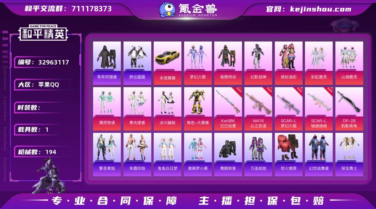 【新101 猪妹 极限 满级心之恋语 咩咩 兔兔 胖达 满地铁天赋】c28895-【无二次协助处理】【因赛季更新游戏段付以上号为准!】 苹果Q-1稀有1载具10粉装6特效枪17热门131套装194枪皮 9印记 历史超级王牌17星 【1稀有】 奇异狩猎者 【1载具】 永恒黄蜂 【10粉装】 梦幻火箭 幻影 大黄蜂 缤纷油彩 极限特训 冰川幽秘 薄荷物语 山涧鹿灵 彩虹鹿灵 寒光使者 【6特效枪】 SCAR-L-梦幻火箭 (6级) SCAR-L-锦绣绵绵 (5级) M416-心之恋语 (7级) Kar98K-巳巳如意 (5级) DP-28-豹影疾电 (5级) Mk14-福马献瑞 (4级) 【17热门】 龟仙人 糯粉咩咩 万圣娃娃 鹰眼刺客 兔兔白日梦 激萌罗小黑 胖达圆圆 团圆交子 瑞龙福将 狂沙舞者 漫步者 破蛋小黄鸡 M762-瑞龙福将 47-林间仙鹿 Mini14-林间仙鹿 汤姆逊-林间仙鹿 GROZA-林间仙鹿 【2飞行器】 星夜魔法师飞行翼 天之羽翼飞行器 【1头盔】 梦幻火箭头盔 【2背包】 心之恋语背包 夏日绵绵冰背包