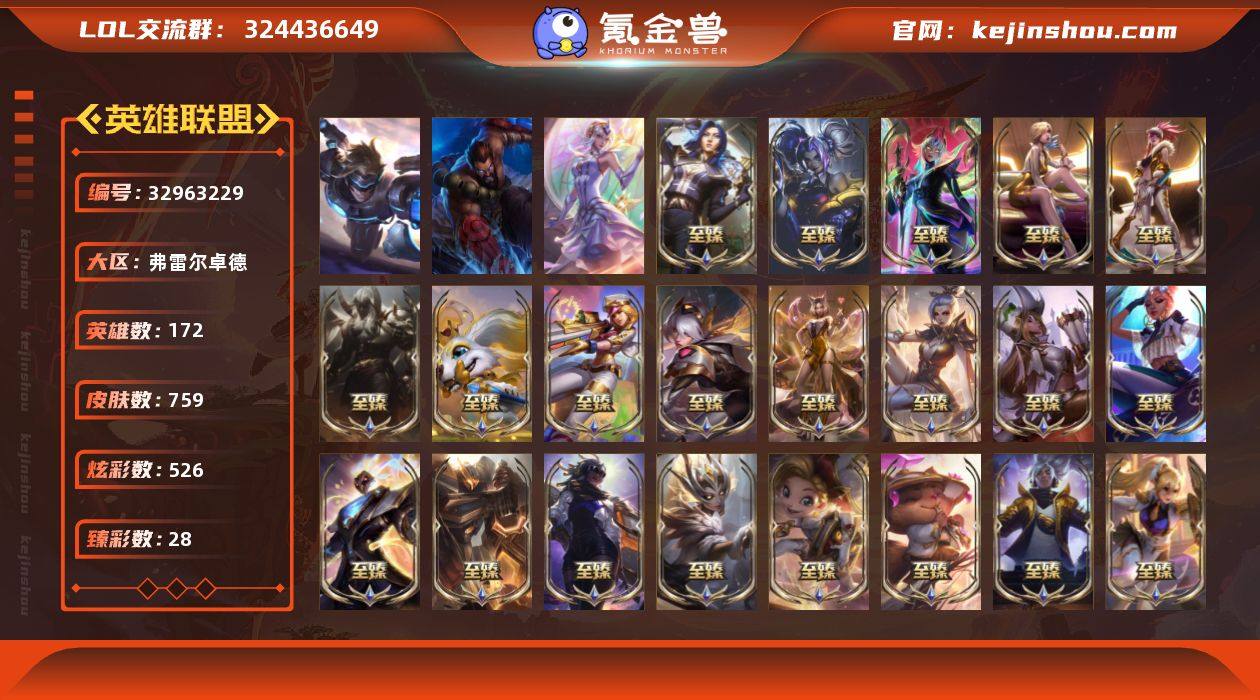 实名: 可修改 英雄数: 172 皮肤数: 759 炫彩数: 526 至臻: 至臻 源计划:正义 艾瑞莉娅,至臻 腥红之月 亚托克斯,至臻 未来战士 锤石,至臻 K/DA 阿狸,至臻 王国机神玄武 盖伦,至臻 玉剑传说 武剑仙,至臻 电玩女神 凯特琳,至臻 绒毛菲兹,至臻 魅惑女巫 厄运小姐,至臻 真实伤害 奇亚娜,至臻 真实伤害 赛娜,至臻 K/DA 阿卡丽,至臻 K/DA 伊芙琳,至臻 魔女 婕拉,至臻 飞升战神 潘森,至臻 太空律动 节奏幻师 璐璐,至臻 魔女 乐芙兰,至臻 女帝 黛安娜,至臻 源计划:阴 劫,至臻 战斗学院 蕾欧娜,至臻 灵能特工 伊泽瑞尔,至臻 灵魂莲华 提莫,至臻 神龙尊者 炎龙瑟提,至臻 K/DA ALL OUT卡莎,至臻 奥术师 佐伊,至臻 真实伤害 亚索,至臻 黑夜使者 凯隐,至臻 魅惑女巫 莫甘娜,至臻 神龙尊者均衡之龙 沃利贝尔,至臻 焰执事 布兰德,至臻 青花瓷 拉克丝,至臻 幻灵战斗猫 金克丝,至臻 西部魔影 泰隆,至臻 海之歌 萨勒芬妮,至臻 星之守护者 辛德拉,至臻 灵魂莲华 易,至臻 青花瓷 丽桑卓,至臻 绝息圣堂 厄运小姐,至臻 花仙使者 卡特琳娜,至臻 墨之影武者 亚索,至臻 斗魂觉醒 派克,至臻 心之钢 永恩,至臻 至高天 凯尔,至臻 魔域梦魇 泽丽,至臻 双城之战2 指挥官 凯特琳 海克斯: 海克斯 嘉文四世,恐...
