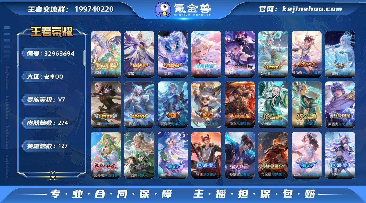 【王者荣耀】珍品无双1 典藏2 无双0 珍品传说2 传说8 史诗82 英雄127 皮肤274 贵族7级 珍品无双:馥梦繁花__荣耀典藏:神鉴启示录|幻阙歌__珍品传说:大耳狗之梦|酷洛米之心__传说皮肤:海洋之心|云鹰飞将|飞鸢探春|游龙清影|霜月吟|逐花归海|乘龙·问璇玑|云诺千山__稀有限定:白晶晶|至尊宝|蔷薇恋人|白鹤梁神女|拒霜思|百解令|大漠名商|地狱燃心|古海寻踪|海滩派对|海盐诗旅|胡桃夹子|皇家上将|剑破天穹|江河有灵|金庭之子|黎明之约|魔术师|奇幻香踪|千军破阵|擒涛扼浪|青焰无极|驱傩正仪|燃音魔法|荣光圣徽|沙漠行僧|探海日志|天穹祈灯|五谷丰年|纤云弄巧|阴阳师|驭风魔法|遇见飞天|原初追逐者|云间偶戏|暗夜猫娘|暗隐猎兽者|缤纷独角兽|冰冠公主|冰雪圆舞曲|德古拉伯爵|伽罗-琥珀纪元|功夫厨神|鬼剑武藏|唤灵魅影|黄金分割率|节奏热浪|金属风暴|乐园奇幻夜|李元芳-蔬乡物语|吕布-末日机甲|魅力维加斯|魅语|梦奇-顽趣|女仆咖啡|偶像歌手|热力回旋|圣诞狂欢|圣诞恋歌|诗语江南|鲁班七号-蔬乡物语|水果甜心|水晶猎龙者|孙策-猫狗日记|天才门将|晚萤|赵云-未来纪元|星夜王子|雪上飞焰|摇滚巨星|鹰眼统帅|幽灵船长|月团寄思|至美·乘鲤谣|逐浪之夏|紫霞仙子|虞姬-夏日便利店|天穹之誓...