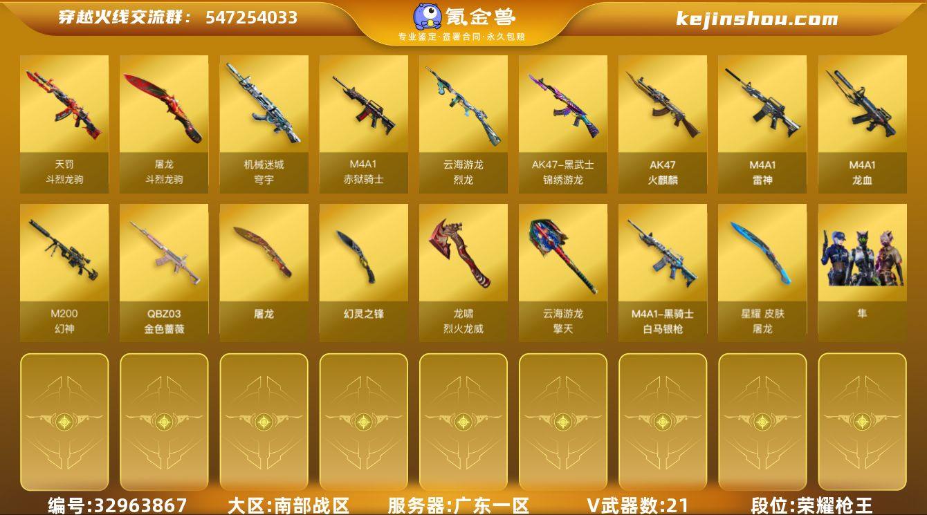 【自带包赔 最高三倍】:南部战区:广东一区-LV102-高阶大元帅-荣耀传说-21V-0王者武器数-0炫金武器数 【热门武器】:QBZ03-金色蔷薇,M200-幻神 【皮肤】:雷神-耀金皮肤,屠龙-星耀 皮肤 【角色】:隼,云海玲珑,斗烈龙骑,风暴女,灵狐者-X,麻雀,潘多拉-X,潘多拉-甜心教官,铁骑荣耀,新娜塔莎,团团 【人偶武器】:AWM-灵狐-15周年嘉年华,迷你牛牛*2 【挑战大师】:AK47-冰龙粉碎者 【英雄级武器】:AK47-火麒麟,M4A1-雷神*2,M4A1-龙血,黑武士-锦绣游龙,QBZ03-金色蔷薇,机械迷城-穹宇,天罚-斗烈龙驹,M200-幻神,烈龙-云海游龙,屠龙,幻灵之锋,擎天-云海游龙,屠龙-斗烈龙驹,龙啸-烈火龙威,高爆手雷-幻灵,手雷-云海游龙,闪光弹-幻灵,烟雾弹-幻灵,M4A1-赤狱骑士 道具、段位等以实际验号为准。如账号因没有维护,赛季更新等不可抗因素发生变化,不属于账号质量问题"