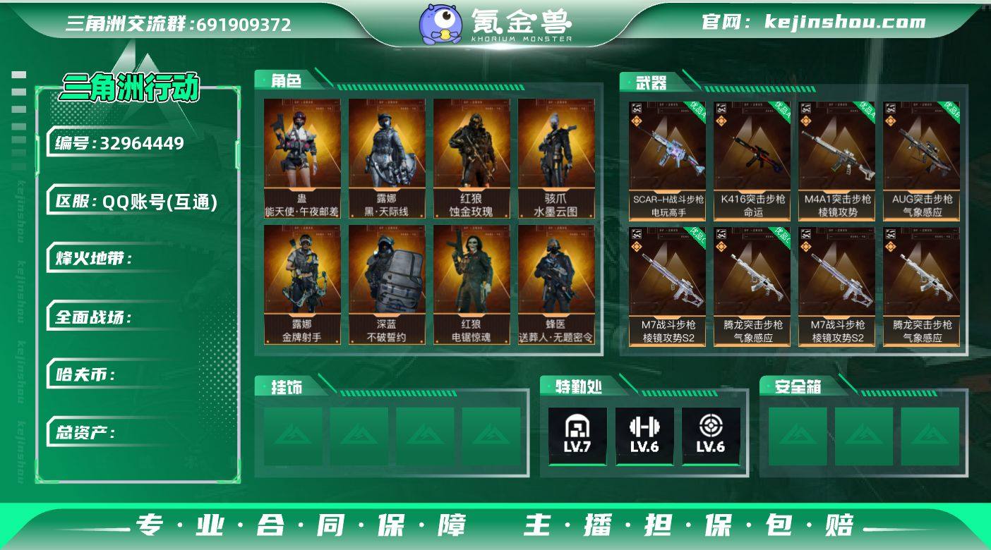 实名: 可修改 干员外观: 红狼-蚀金玫瑰,骇爪-水墨云图,蜂医-送葬人·无题密令(S5),露娜-黑·天际线,蛊-能天使·午夜邮差,深蓝-不破誓约(S6),红狼-电锯惊魂,露娜-金牌射手(S7) 传说武器皮肤: M4A1突击步枪-棱镜攻势(典藏),Vector冲锋枪-美杜莎(典藏),SCAR-H战斗步枪-电玩高手(典藏),近战-黑海,K416突击步枪-命运(典藏),AUG突击步枪-气象感应(典藏),腾龙突击步枪-气象感应(典藏),M7战斗步枪-棱镜攻势S2(典藏),近战-信条