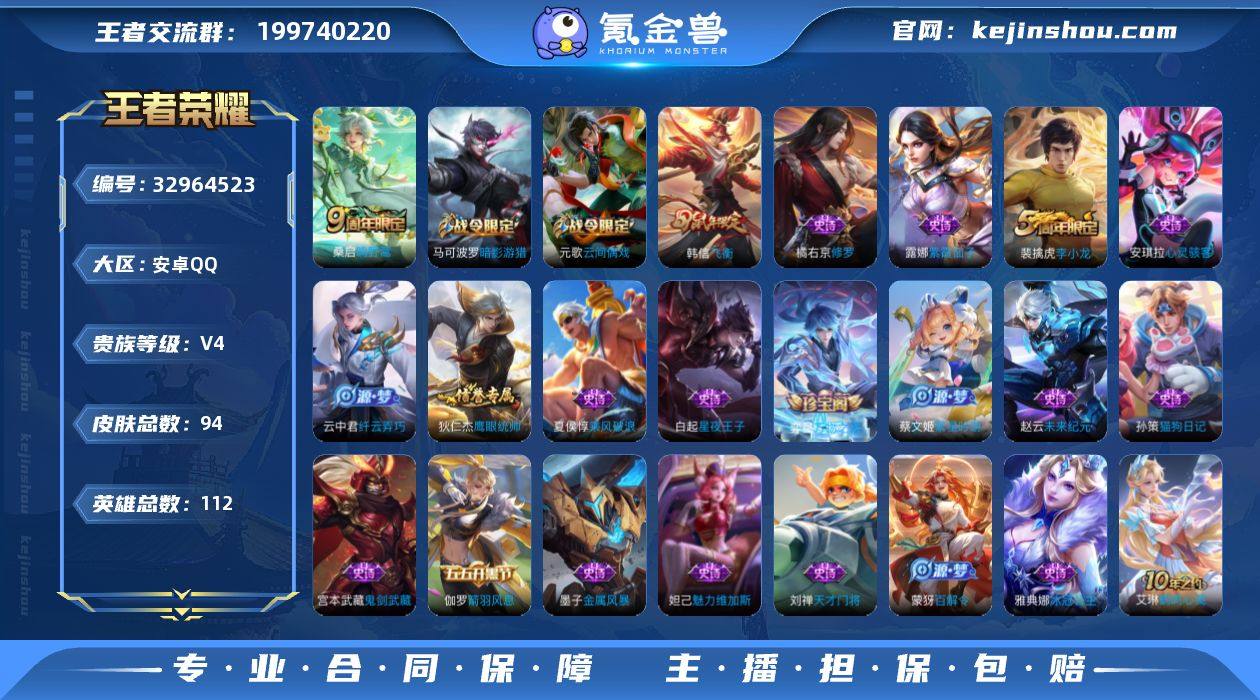 安卓Q-V0-荣耀黄金II段位-112英雄-94皮肤-1传说-22史诗 【传说皮肤】:桑启鸣野蒿 【限定皮肤】:狄仁杰阴阳师,元歌云间偶戏,夏侯惇朔风刀,马可波罗暗影游猎,狄仁杰万华元夜,项羽海滩派对,老夫子醍醐杖,程咬金演武夺筹,韩信飞衡,亚瑟潮玩骑士王,牛魔御旌,李元芳云中旅人,钟馗驱傩正仪,蔡文姬繁星吟游,鬼谷子原初探秘者,弈星混沌棋,沈梦溪大漠名商,明世隐疑决卦,裴擒虎李小龙,裴擒虎擒涛扼浪,狂铁御狮,米莱狄御霄,云中君纤云弄巧,盾山御銮,猪八戒西部大镖客,鲁班大师探海日志,桑启海盐诗旅,张良古海寻踪,蒙犽百解令,鬼谷子天穹祈灯 【年限皮肤】:韩信飞衡 【赛季限定】:狂铁御狮,米莱狄御霄,牛魔御旌,盾山御銮,夏侯惇朔风刀,弈星混沌棋,明世隐疑决卦,老夫子醍醐杖,鬼谷子原初探秘者,狄仁杰万华元夜,程咬金演武夺筹,钟馗驱傩正仪,沈梦溪大漠名商,李元芳云中旅人,桑启海盐诗旅,裴擒虎擒涛扼浪,鲁班大师探海日志,张良古海寻踪,鬼谷子天穹祈灯,东皇太一噬灭天穹 【战令限定】:马可波罗暗影游猎,猪八戒西部大镖客,元歌云间偶戏,亚瑟潮玩骑士王 【史诗皮肤】:弈星万物之道,蒙犽百解令,元歌云间偶戏,云中君纤云弄巧,裴擒...
