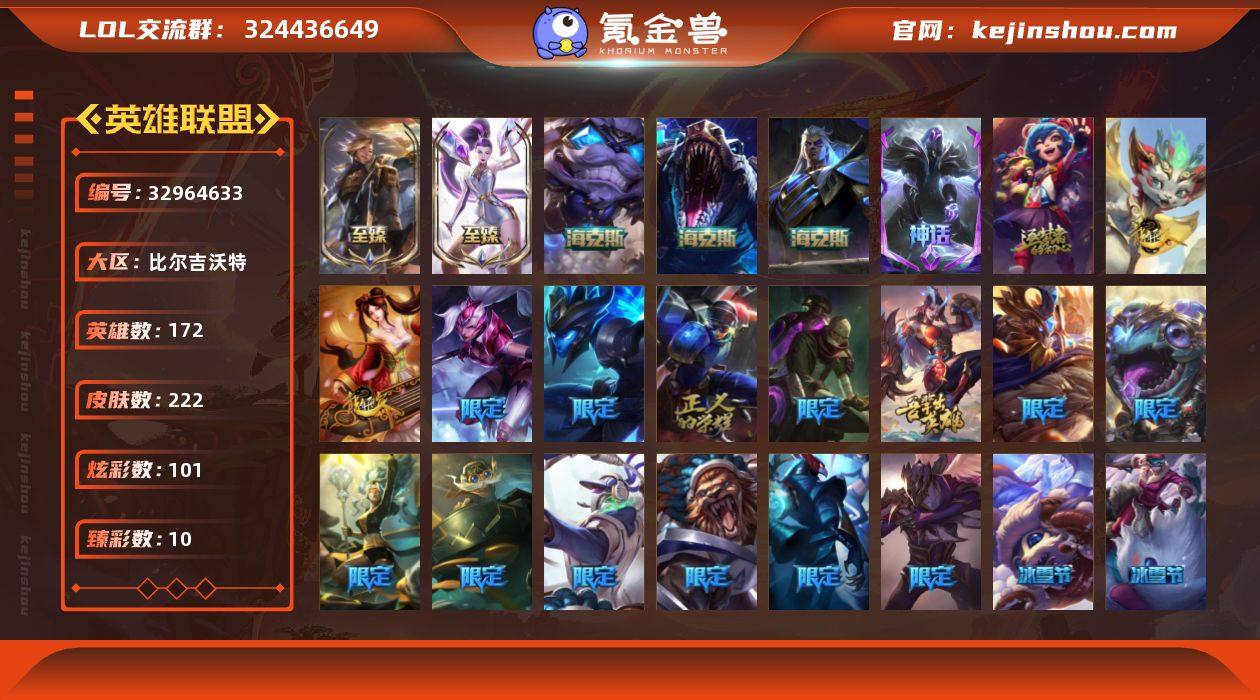 未定级段位-172英雄-222皮肤-101炫彩-0终极-8神话-24限定-27传说-57史诗 【神话皮肤】:十周年纪念安妮,神凰行者瑞羽圣凰艾尼维亚,灰烬骑士派克 【至臻皮肤】:至臻灵能特工伊泽瑞尔,至臻KDAALLOUT卡莎 【海克斯皮肤】:海克斯科技斯维因,海克斯科技雷克顿,海克斯科技吉格斯 【臻彩皮肤】:无畏骑士瑟庄妮赤子初心,赵云子龙炫金将军,霸天异形卡兹克掠空魅影,星之守护者娑娜未来之光,星之守护者奥莉安娜未来之光,西部天使赛娜贝利尔之怠,可爱可爱粉红红布里茨,魔女阿卡丽虚荣,净雪之月莫甘娜冬虹,红莲之刃锐雯 【年限皮肤】:古琴余韵娑娜,天龙之子斯莫德,龙马烈焰波比 【冰雪限定】:圣诞狂欢基兰,喜庆之树茂凯,魄罗骑士瑟庄妮,圣诞老人德莱文,冰雪兽纳尔 【限定皮肤】:冠军之矛卡莉丝塔,Fnatic迦娜,Fnatic库奇,SSW雷恩加尔,SSW锤石,SKTT1阿兹尔,SKTT1烬,暗裔英雄盖伦,胜利之树茂凯,胜利巨口克格莫,鬼影重重魔腾,无头骑士赫卡里姆,勇者奈德丽,玉剑传说舞龙卫,防暴天使凯尔,双城之战2微光实验室辛吉德 【传说皮肤】:铁哥们儿奥拉夫,血石领主弗拉基米尔,大天使长米迦勒凯尔,约德尔国队长提莫,合金巨兽努努和威朗普,幻灵战斗队长厄运...