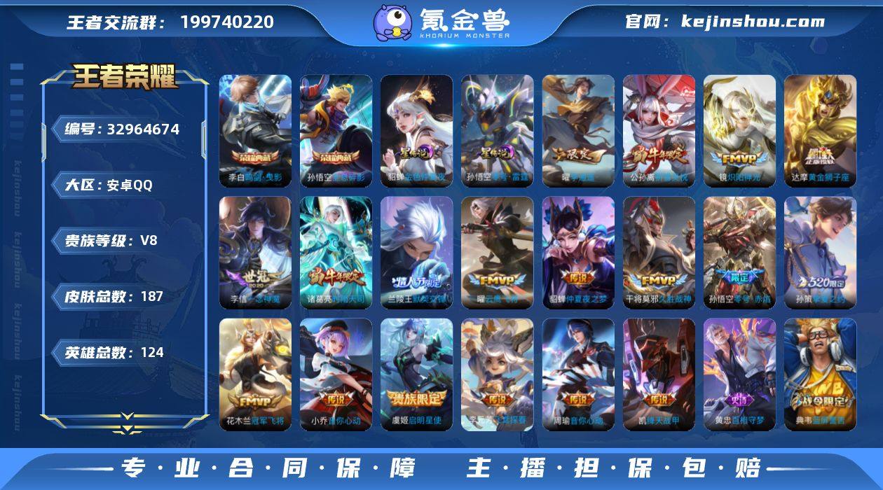 安卓Q-V0-荣耀黄金III段位-124英雄-187皮肤-2典藏皮肤-18传说-58史诗 【荣耀典藏】:孙悟空全息碎影,李白鸣剑曳影 【传说皮肤】:孙策挚爱之约,曜李逍遥 ,周瑜音你心动,小乔音你心动,李元芳飞鸢探春,兰陵王默契交锋,公孙离祈雪灵祝,诸葛亮时雨天司,铠绛天战甲,镜炽阳神光,虞姬启明星使,孙悟空零号赤焰,曜云鹰飞将,李信一念神魔,干将莫邪久胜战神,达摩黄金狮子座,花木兰冠军飞将,貂蝉仲夏夜之梦 【限定皮肤】:白起狰,狄仁杰阴阳师,赵云皇家上将,墨子神迹守卫,孙尚香蔷薇恋人,鲁班七号狮舞东方,庄周蜃楼王,高渐离死亡摇滚,阿轲迷踪丽影,孙膑妖精王,芈月重明,芈月白晶晶,吕布猎兽之王,吕布御风骁将,周瑜赤莲之焰,元歌云间偶戏,夏侯惇朔风刀,甄姬游园惊梦,曹操烛龙,典韦穷奇,典韦蓝屏警告,马可波罗暗影游猎,狄仁杰魔术师,狄仁杰万华元夜,达摩星际陆战队,达摩沙漠行僧,项羽海滩派对,老夫子醍醐杖,老夫子航海奇遇记,关羽冰锋战神,程咬金演武夺筹,刘邦夺宝奇兵,韩信飞衡,兰陵王默契交锋,兰陵王驯魔猎人,兰陵王金庭之子,花木兰默契交锋,亚瑟潮玩骑士王,孙悟空零号赤焰,牛魔御旌,后羿如梦令,李元芳银河之约,李元芳云中旅...