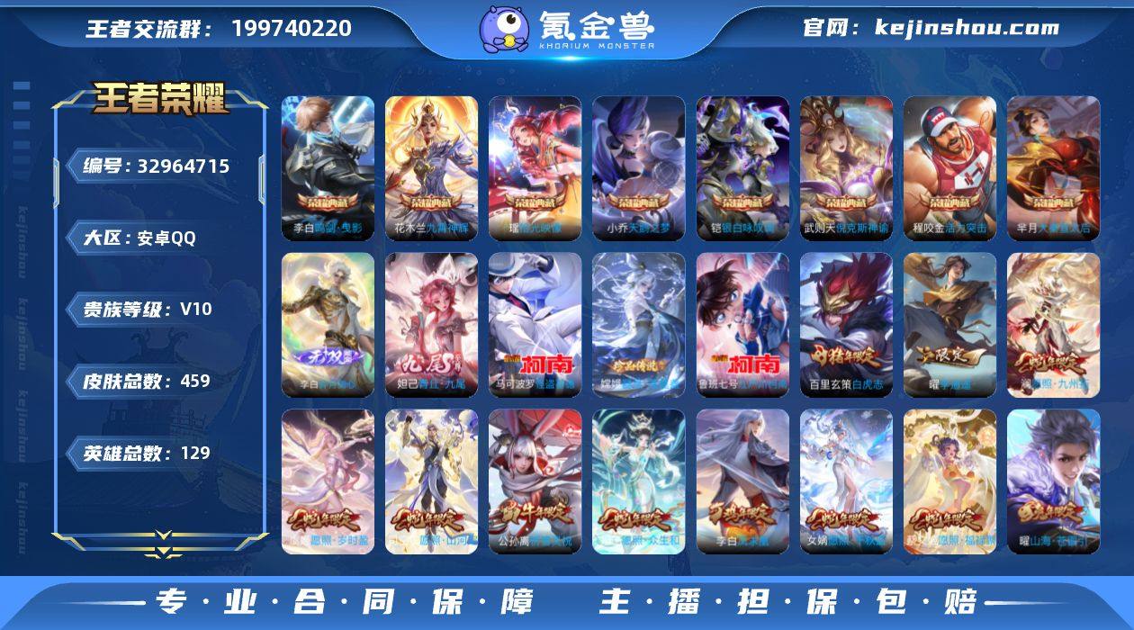 【省标艾琳 v10 459皮 9典藏 武则天 瑶 铠 花木兰 李白 倪克斯神谕 程咬金 小乔 芈月 2无双 李白 妲己 3珍品传说 嫦娥 马可波罗 鲁班七号 50传说 4星传说 1天幕】实名: 可修改 贵族等级: V10 英雄数: 129 皮肤数: 459 荣耀水晶: 武则天,天鹅之梦,倪克斯神谕,活力突击,大秦宣太后,鸣剑·曳影,九霄神辉,银白咏叹调,拾光映像 无双皮: 青丘·九尾,碎月剑心 珍品传说: 江户川柯南,怪盗基德,器灵·落星盏 传说皮: 冠军飞将,云鹰飞将,黄金白羊座,猫影幻舞,久胜战神,炽阳神光,一念神魔,云霓雀翎,末日机甲-孙尚香,地狱火,仲夏夜之梦,零号·赤焰,地狱之眼,音你心动-周瑜,李逍遥,游龙清影,淬星耀世,超时空战士-狄仁杰,无双飞将,山海·苍雷引,燃星之曲,画中仙,电玩·雷克斯,鹤羽星尊,艾琳觅芳踪,幻光神枪,星之鸣奏,续相思 限定皮: 遇见飞天,李小龙,祈雪灵祝,梁祝,时雨天司,异界灵契-孙尚香,神威,时之彼端,飞衡,太华,冰霜恋舞曲,天狼运算者,逐梦之星,神奇女侠,凤求凰,白虎志,朱雀志,至尊宝,武陵仙君,如梦令-后羿,大圣娶亲,默契交锋-花木兰,高山流水,圣诞老人,孙行者,匿光追影者,前尘镜,枫霜尽,五谷丰年,绯月行,诗剑行,怒海麟威,山海·玄木吟,冰霜神祇,齐天大圣,鸣野蒿,映山客,逐霄战戟,愿照·千秋盛...