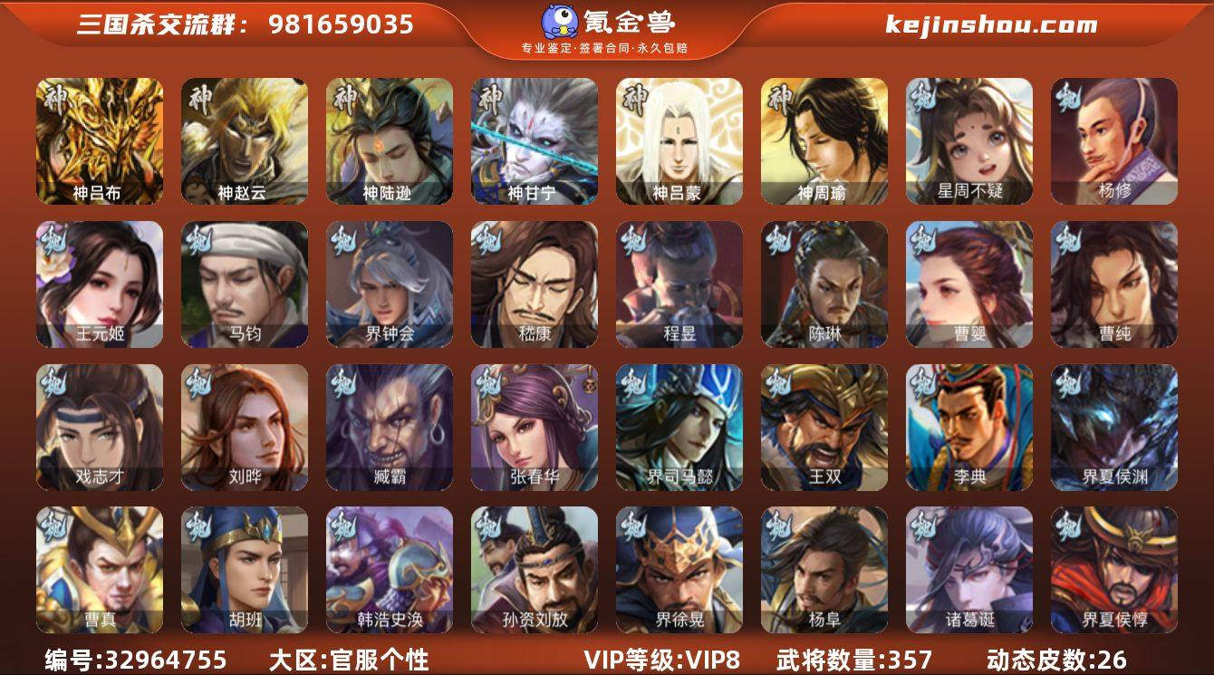 神吕布,神赵云,神陆逊,神甘宁,星周不疑,杨修,王元姬,马钧,界钟会,嵇康,陈琳,曹婴,曹纯,戏志才,刘晔,程昱,马云騄,谋赵云,诸葛瞻,沙摩柯,谯周,界黄忠,董允,孙皓,界朱然,界徐盛,谋孙尚香,左慈,张让,苏飞,麹义,界李儒,杜预,卑弥呼,谋张角,星董卓,兀突骨,神吕蒙,神周瑜,SP关羽,SP曹仁,SP蔡文姬,乐进,曹昂,诸葛诞,朱灵,文聘,SP姜维,张春华,钟会,曹冲,郭淮,满宠,界王异,界曹操,界司马懿,界夏侯惇,界张辽,界许褚,界郭嘉,李典,曹真,韩浩史涣,陈群,曹叡,钟繇,司马朗,王基,李通,郭皇后,孙资刘放,辛宪英,界甄姬,吕虔,鲁芝,界荀彧,界徐晃,杜畿,界邓艾,张恭,界曹植,界满宠,界郭淮,卞夫人,辛毗,华歆,蔡贞姬,袁涣,王双,崔琰,毛玠,杨阜,谋徐晃,谋于禁,界曹休,胡班,界夏侯渊,臧霸,SP孙尚香,关银屏,夏侯霸,马良,关兴张苞,廖化,界马岱,关平,简雍,刘封,界法正,界关兴张苞,界刘备,界关羽,界张飞,界赵云,界马超,SP徐庶,吴懿,周仓,张松,刘谌,糜竺,李严,黄皓,吴苋,秦宓,界黄月英,界诸葛亮,赵统赵广,界伊籍...