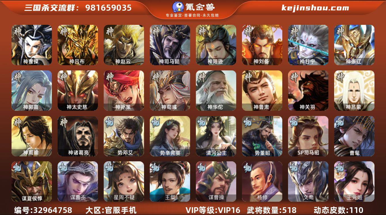 【4730】官阶:大将军;VIP等级:VIP16;史诗武将数量:105;动态皮肤数量:110;武将总数:518;史诗宝珠数量:0;将魂数量:12962;神将:15;魏国史诗武将:48;蜀国史诗武将:19;吴国史诗武将:16;群史诗武将:33 神曹操,神吕布,神赵云,神司马懿,神陆逊,神刘备,神甘宁,神张辽,神郭嘉,神太史慈,神孙策,神荀彧,神华佗,神诸葛亮,神鲁肃,SP司马昭,曹髦,星周不疑,王粲,谋曹操,杨修,王元姬,王凌,界钟会,界于禁,界曹真,嵇康,郝昭,陈琳,曹婴,曹纯,戏志才,刘晔,谋夏侯惇,谋曹丕,势董昭,清河公主,势辛宪英,程昱,势邓艾,关索,谋诸葛亮,谋刘备,马云騄,谋黄忠,谋赵云,谋马超,诸葛瞻,周群,赵襄,张星彩,王平,沙摩柯,谯周,界黄忠,花鬘,董允,谋关羽,势魏延,张奋,谋黄盖,谋孙策,周处,孙皓,孙寒华,骆统,留赞,界朱然,界徐盛,界步练师,贺齐,势陆郁生,势太史慈,文鸯,谋公孙瓒,十常侍,谋貂蝉,界沮授,左慈,张仲景,张让,张琪瑛,杨彪,星黄忠,星甘宁,王允,陶谦,苏飞,麹义,庞德公,祢衡,刘焉,沮授,界左慈,界李儒,杜预,卑弥呼,谋张角,许攸,势于吉,友诸葛亮,星董卓,SP甄姬,兀突骨,士燮,司马昭,神吕蒙,神周瑜,神关羽,势夏侯尚,SP关羽,SP曹仁,SP蔡文姬,乐进,曹昂,诸葛诞,朱灵,文聘,SP姜维,张春华,钟会,曹冲,郭淮,满宠,...