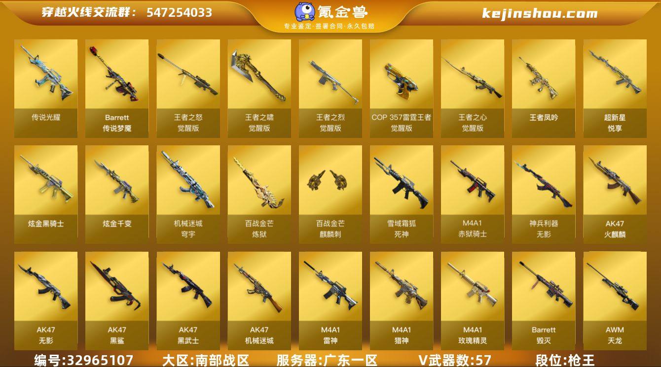 广东一区-67V-13王者武器数-2炫金武器数 【传说武器】:传说光耀,传说梦魇 【热门武器】:传说光耀,传说梦魇,QBZ03-金色蔷薇,M4A1-青龙,汤姆逊-烈龙*2,加特林-炼狱,羊驼玩偶,沙鹰-修罗*3 【王者炫金武器】:超新星-悦享,王者凤吟,高爆手雷-雷霆王者,炫金骑士,炫金千变 【音效卡】:M4A1-雷神音效卡,Barrett-碧霄极光音效卡,白虎-盛典舞曲音效卡,炼狱-百战金芒-庆典舞曲音效卡,死神-雪域霜狐-怀旧音效卡 【皮肤】:雷神-暗月,雷神-虎将,雷神-烈虎皮肤,雷神-宇航兔皮肤,雷神-维纳斯皮肤,M4A1-雷神-新春神龙皮肤,M4A1-再燃火线,火麒麟-雷神,火麒麟-平天大圣,火麒麟-百城,火麒麟-心动糖果,毁灭-暗月,毁灭-英雄计划 皮肤,M4A1-千变-孔明皮肤*2,黑骑士-暗月,无影-暗月*2,无影-能量核心*4,黑武士-典韦皮肤,天启-暗月,战神-流金岁月皮肤*2,天神-暗月*2,轻型军用手斧-再燃火线 【角色】:机械姬,零·纪元,战地猎狐,王者-瞳-闭月羞花,雪域霜狐,蛇隐宗,乔伊教练,葵-阿尔法武装,空,暗夜-X,虎妞,嘉年华灵狐,娟娟,灵狐者-黄金海岸,灵狐者-七夕宝贝,曼陀罗-X,邱刚敖,青霞仙子,蛇姬,斯沃特-X 【人偶武器】:天龙-曼陀罗,巴雷特-零-水...