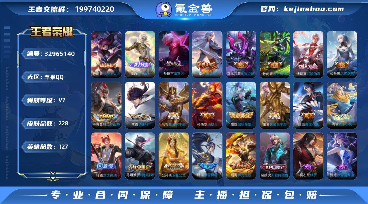 实名: 可修改 贵族等级: V7 英雄数: 127 皮肤数: 228 荣耀水晶: 杀手不太冷 无双皮: 碎月剑心 星传说: 幽冥火 传说皮: 黄金射手座,黄金白羊座,久胜战神,末日机甲-孙尚香,地狱火,地狱之眼,音你心动-周瑜,记忆之芯 限定皮: 李小龙,梁祝,辉光之辰,逐梦之翼,天狼狩猎者,逐梦之影,凤求凰,美猴王,武陵仙君,傲雪梅枪,玉兔公主,五谷丰年,诗剑行 亮点: 【WZ182019】苹果Q-V7-最强王者段位-127英雄-228皮肤-1典藏皮肤-1无双-13传说-59史诗【英雄全皮】:孙权全皮,敖隐全皮,影全皮【荣耀典藏】:孙尚香杀手不太冷【无双皮肤】:李白碎月剑心【传说皮肤】:狄仁杰神骥赴朔漠,公孙离记忆之芯,李白诗剑行,周瑜音你心动,虞姬启明星使,张良黄金白羊座,干将莫邪久胜战神,后羿黄金射手座,诸葛亮武陵仙君,李白凤求凰,孙尚香末日机甲,宫本武藏地狱之眼,孙悟空地狱火【限定皮肤】:白起狰,姜子牙天穹之誓,杨戬破阵退雄兵,狄仁杰阴阳师,赵云皇家上将,嬴政优雅恋人,嬴政白昼王子,鲁班七号狮舞东方,芈月重明,吕布猎兽之王,夏侯惇朔风刀,曹操烛龙,典韦穷奇,马可波罗暗影游猎,狄仁杰魔术师,狄仁杰万华元夜,达摩沙漠行僧,项羽海滩派对,老夫子醍醐杖,程咬金演武夺筹,韩...