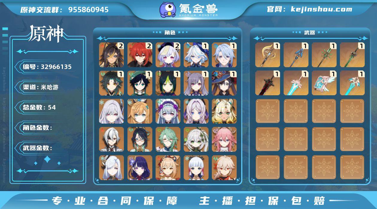 邮箱: 不送邮/死邮 总黄数: 54 冒险等级: 60 2命金色角色: 二命迪卢克,二命七七,二命迪希雅 1命金色角色: 一命温迪,一命刻晴,一命莫娜,一命魈,一命神里绫人,一命提纳里,一命芙宁娜 0命金色角色: 枫原万叶,优菈,神里绫华,宵宫,可莉,达达利亚,钟离,琴,甘雨,雷电将军,申鹤,八重神子,纳西妲,白术,闲云,阿蕾奇诺,希诺宁,茜特菈莉,梦见月瑞希,爱可菲,丝柯克 1精武器: 狼的末路,天空之卷,和璞鸢,天空之傲,天空之刃,磐岩结绿,息灾,裁断