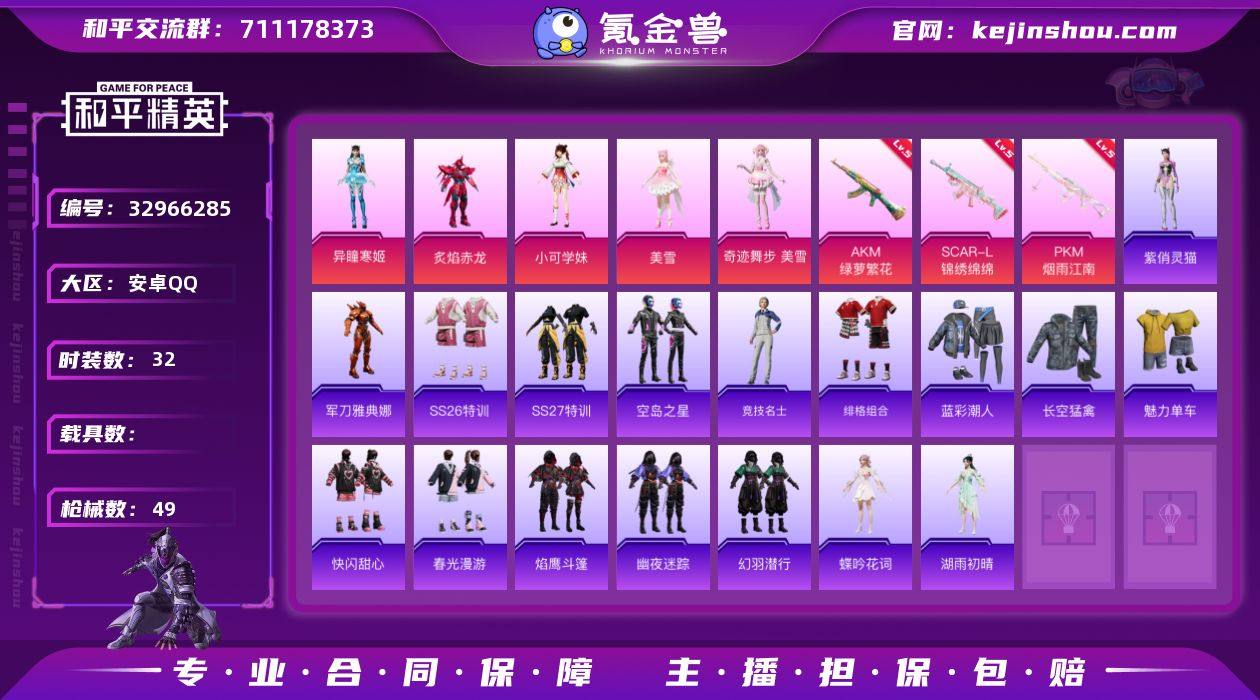 安卓 手Q-5粉装-3特效枪-0载具-1粉色飞行器-15084热力值-1王牌印记-32套装-49枪皮 【热门品类】:角色-军刀雅典娜 【粉色套装】:粉装-炙焰赤龙,角色-小可学妹,角色-美雪,角色-奇迹舞步 美雪,角色-异瞳寒姬 【粉色枪皮等级】:AKM-绿萝繁花(五级),SCAR-L-锦绣绵绵(五级),PKM-江南烟雨(五级) 【粉色枪皮】:AKM-绿萝繁花,SCAR-L-锦绣绵绵,PKM-江南烟雨 【粉色飞行器】:炫彩糖果飞行器 【粉色降落伞】:古战神甲降落伞,辉耀战甲降落伞,江南烟雨降落伞,异瞳寒姬降落伞,炫彩糖果降落伞,虹云熊熊降落伞 【稀有套装】:套装-炫彩糖果,角色-紫俏灵猫 【稀有枪皮】:AUG-冰晶雪宝,AKM-江南烟雨,M416-糯团青竹,AUG-耀粉歌者,AC-VAL-快闪甜心,蜜獾-天降萌叽,UZI-啾咪啾咪,UMP45-极意拳锋,Vector-焰鹰斗篷,汤姆逊-古战神甲,汤姆逊-天降萌叽,P90-快闪甜心,AWM-焰鹰斗篷,SKS-心之恋语,VSS-星之彼岸,Mini14-耀粉歌者,MK20-H-快闪甜心,DBS-焰鹰斗篷,DP-28-焰鹰斗篷,DP-28-古战神甲,MG3-幻世战舞者,沙漠之鹰-快闪甜心,TMP-9-江南烟雨,战术弩-江南烟雨,大砍刀-古战神甲 【其他套装】:套装-SS26特训,套装-SS27特训,套装-空岛之星,套装-竞技名士,套...
