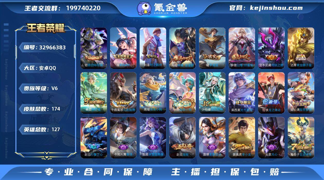 MCK633209 【金标赵云!瑶无双!凯典藏!诗剑行!】 皮肤数量174 印记总数13 【V6】 【至尊星耀】 【可修改】 账号类型3 省标(金标)1 无双1 荣耀典藏1 星元皮肤1 传说7 史诗51 账号类型:打野号,上单号,中单号; 省标(金标):省金标赵云; 无双:瑶_真我赫兹; 荣耀典藏:铠_银白咏叹调; 星元皮肤:刘备_时之羁绊; 传说:达摩_黄金狮子座,马超_神骥·逐星野,干将莫邪_久胜战神,宫本武藏_地狱之眼,桑启_鸣野蒿,李信_山海炽霜斩,曜_李逍遥; 史诗:夏侯惇_乘风破浪,王昭君_偶像歌手,姬小满_妄想食味,廉颇_地狱岩魂,小乔_线条小狗,赵云_龙胆,妲己_热情桑巴,嬴政_摇滚巨星,周瑜_线条小狗,阿珂_节奏热浪,百里守约_特工魅影,莱西奥_光弋星穹,狄仁杰_魔术师,雅典娜_冰冠公主,少司缘-巫礼祀神,裴擒虎_李小龙,李元芳_逐浪之夏,狂铁_龙之律动,牛魔_星界战将,不知火舞_魅语,孙策_猫狗日记,白起_星夜王子,花木兰_水晶猎龙者,杨玉环_遇见飞天,李白_千年之狐,雅典娜_黎明之约,孙尚香_水果甜心,甄姬_冰雪圆舞曲,蒙恬_荣光圣徽,阿古朵_江河有灵,兰陵王_暗隐猎兽者,赵云_未来纪元,小乔_缤纷独角兽,墨子_金属风暴,赵云_引擎之心,刘禅_电玩爆裂...
