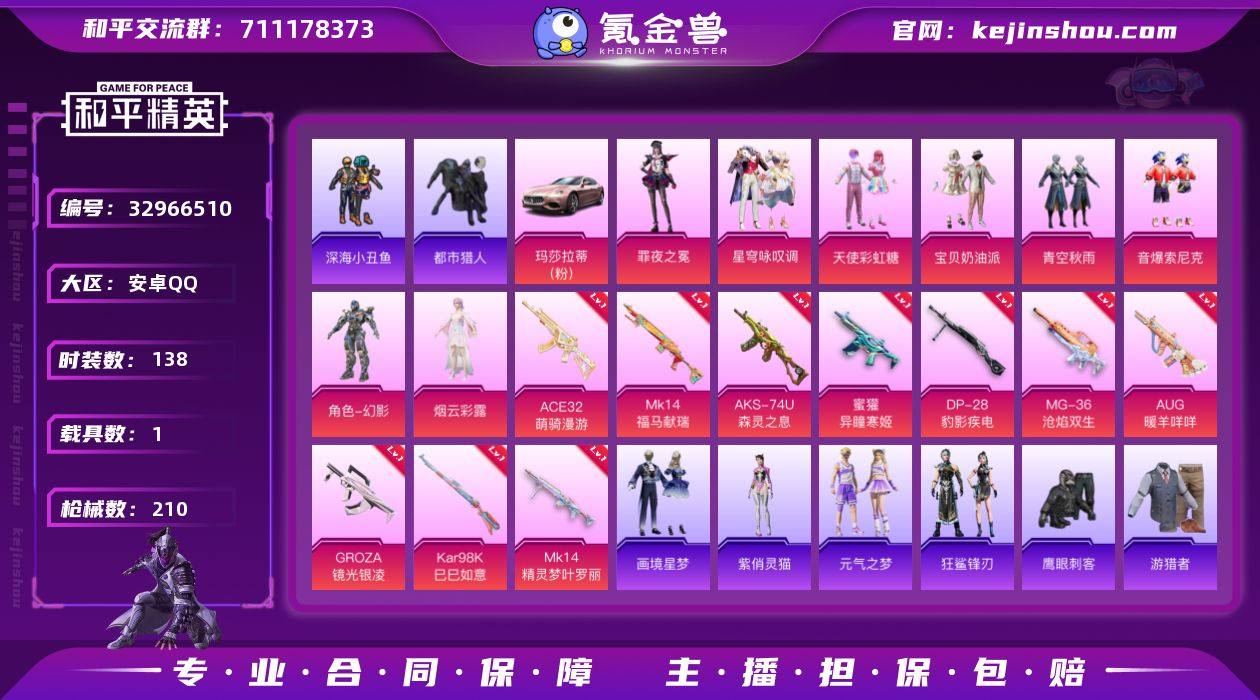 实名: 可修改 时装数: 138 载具数: 1 枪械数: 210 热门装扮: 深海小丑鱼,宝贝奶油派,天使彩虹糖,鹰眼刺客,都市猎人,青空秋雨,音爆索尼克,幻影,烟云彩露,星穹咏叹调,罪夜之冕 载具: 玛莎拉蒂Ghibli(粉) 稀有枪皮: Mk14精灵梦叶罗丽,GROZA-镜光银凌,Kar98K-巳巳如意,AUG-暖羊咩咩,DP-28-豹影疾电,MG-36-沧焰双生,蜜獾-异瞳寒姬,AKS-74U-森灵之息,MK14-福马献瑞,ACE32-萌骑漫游
